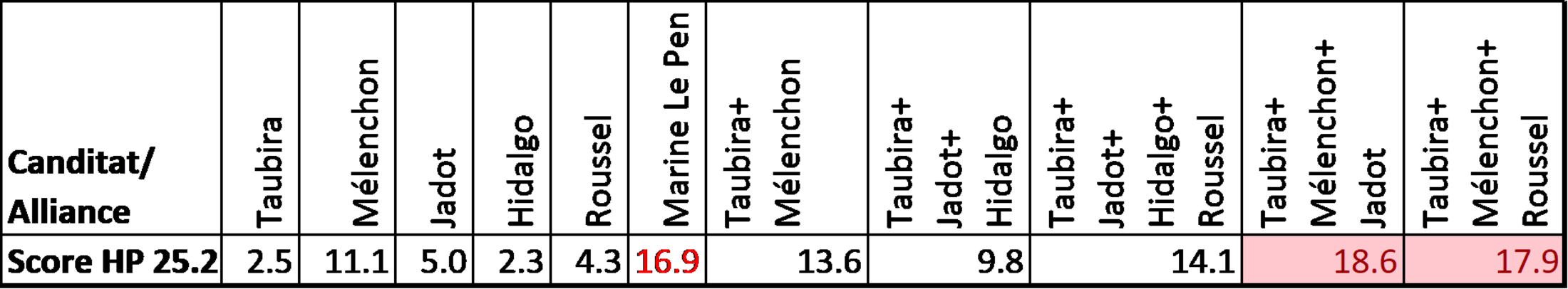 Le tableau ci-dessus reprenant les scores actuels du sondage précédent indique sans ambiguïté qu’aucun regroupement de candidats du bas de tableau négligeant le mieux placé qu’est Jean-Luc Mélenchon, ne permet de passer la rampe du 1er tour, dont le seuil actuel est le score de Marine Le Pen. En sus, il est bien peu vraisemblable, voire contre nature, que Roussel se joigne dans les jours qui viennent aux adversaires de la France Insoumise. Les marges d’erreur et l’artifice consistant à ajouter mécaniquement de tels pourcentages d’opinions à plus d’un mois du scrutin, comme le rôle éventuel d’une embellie une fois l’alliance citoyenne conclue et celui de la réaction du peuple de gauche réfugié dans l’abstention, affectent ces raisonnements d’un facteur d’incertitude. Nous sommes convaincus que les honteux dénigrements du tribun suspecté de poutinisme larvé entrepris par le tandem disjoint Jadot et Hidalgo[10] à la faveur des évènements d’Ukraine, ne mèneront qu’à renvoyer toute victoire possible de la gauche aux calendes grecques.