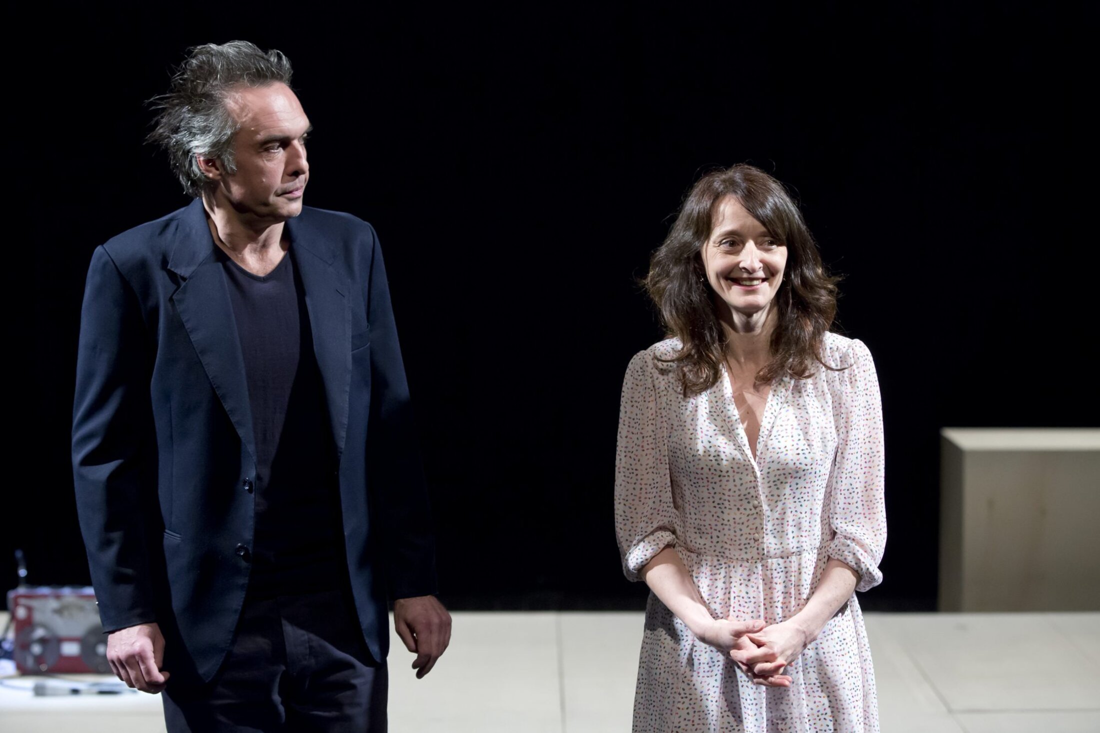 Parmi les temps fort de ce « Tem-po » engagé, nous avons vu « Interview » une judicieuse conception de Nicolas Truong. Avec ce nouveau projet, il poursuit son compagnonnage théâtral, accompagné de ses deux comédiens fétiches, Nicolas Bouchaud et Judith Henry, déjà présents pour le projet Luciole au Festival IN d’Avignon en 2013. Ces deux magnifiques interprètes rejouent durant 1 heure 30 la philosophie « mise en scène » dans une relation interviewé-intervieweur. Le spectacle s’est structuré à partir d’interviews réalisées par Nicolas Truong, Nicolas Bouchaud et Judith Henry ; mis à part les séries de questions tirées des Questionnaires de l’écrivain suisse Max Frisch*. Le « jeu des interviews » reprend des entretiens célèbres, de Florence Aubenas, Jean Hatzfeld, Edgar Morin, Régis Debray, les cinéastes Claudine Nougaret et Raymond Depardon. À titre d’exemple, Florence Aubenas nous donne une définition éclairée d’une bonne interview : « une bonne interview, c’est quand tu es curieux de savoir les réponses. Une mauvaise interview c’est quand tu n’en as rien à faire de ce que le mec te répond ». L’expérience de cette discipline nous apprend aussi : « qu’il ne faut jamais poser des questions au singulier avec les tueurs. C’était le contraire avec les autres mais avec les tueurs, ce n’était jamais « tu ». Il fallait toujours dire « vous » ou « ils ».