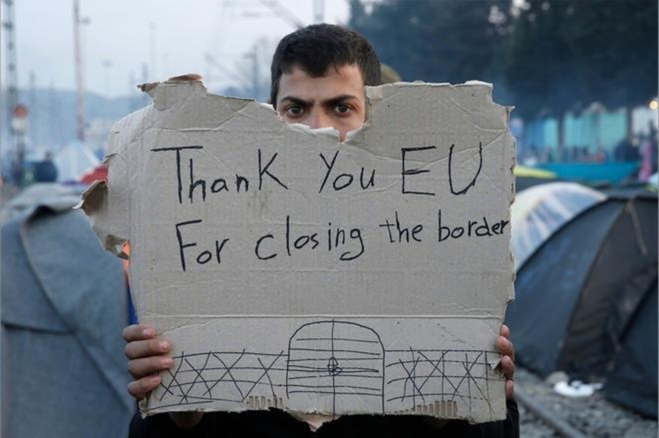 Mars 2016. Un réfugié demande l'ouverture des frontières dans un camp de fortune en Grèce, à la frontière avec la Macédoine. © Alkis Konstantinidis - Reuter