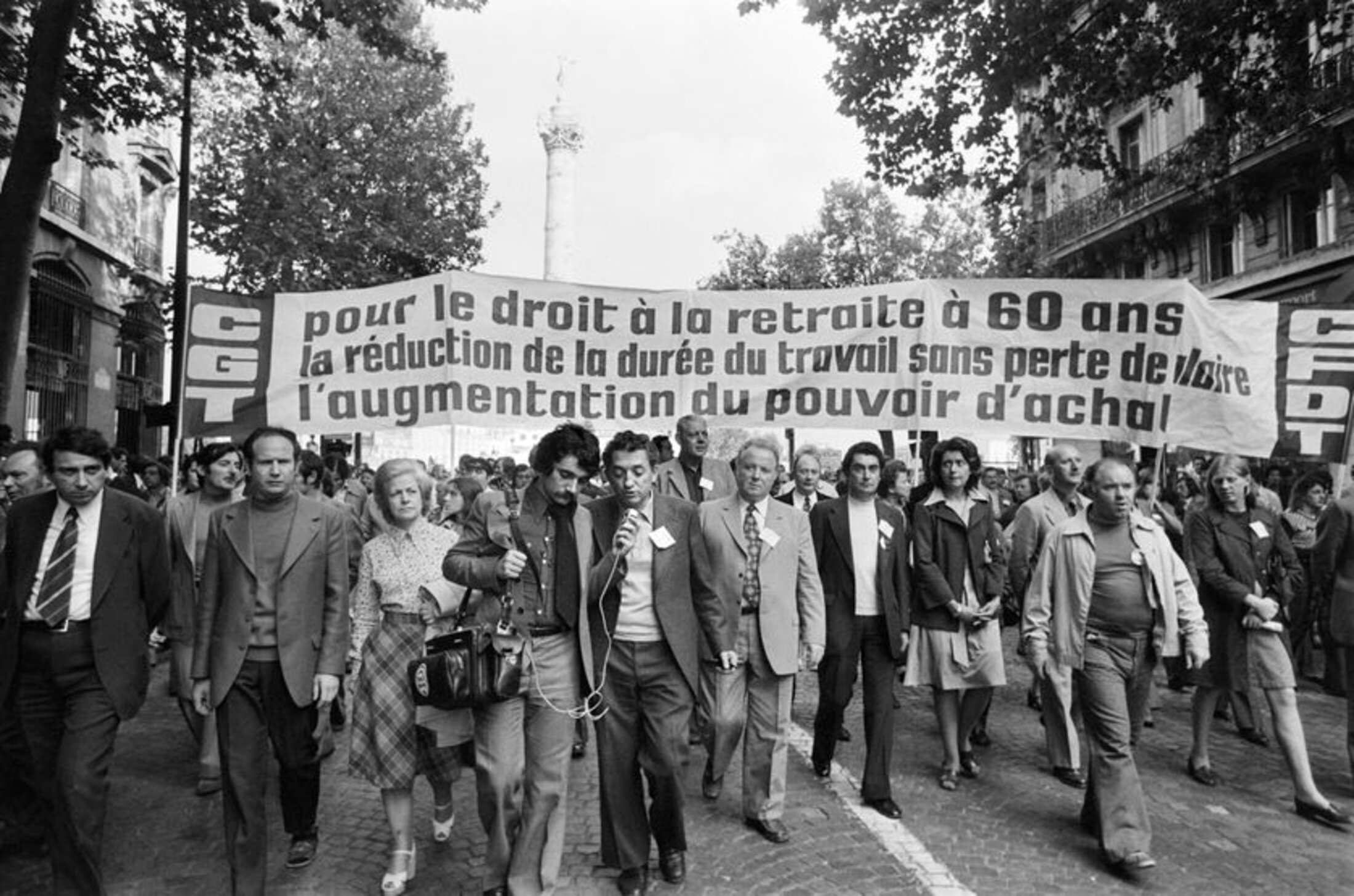Des manifestants participent à la journée revendicative du 23 septembre 1975 à Paris, demandant le droit à la retraite à 60 ans. En tête de cortège, Edmond Maire, secrétaire général de la CFDT © AFP