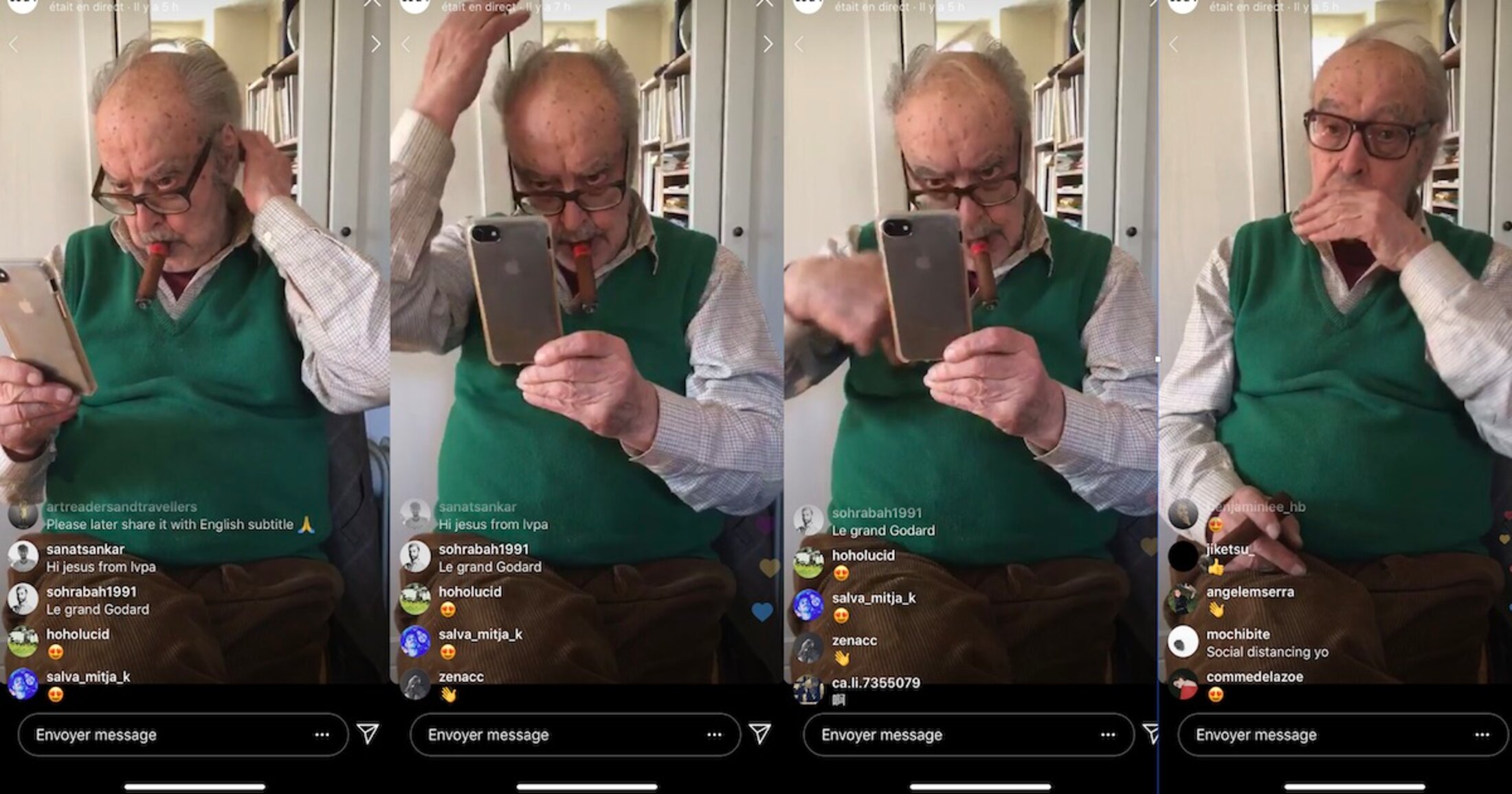 À la fin de l’Insta conversation, tout le monde se remercie, on a même droit à un bonus, live, on voit un bout de son bureau, au sol, des tas de photos, des bouts de scénario. Un commentaire clignote : « Thank God, you can’t affect Jean-Luc Godard »