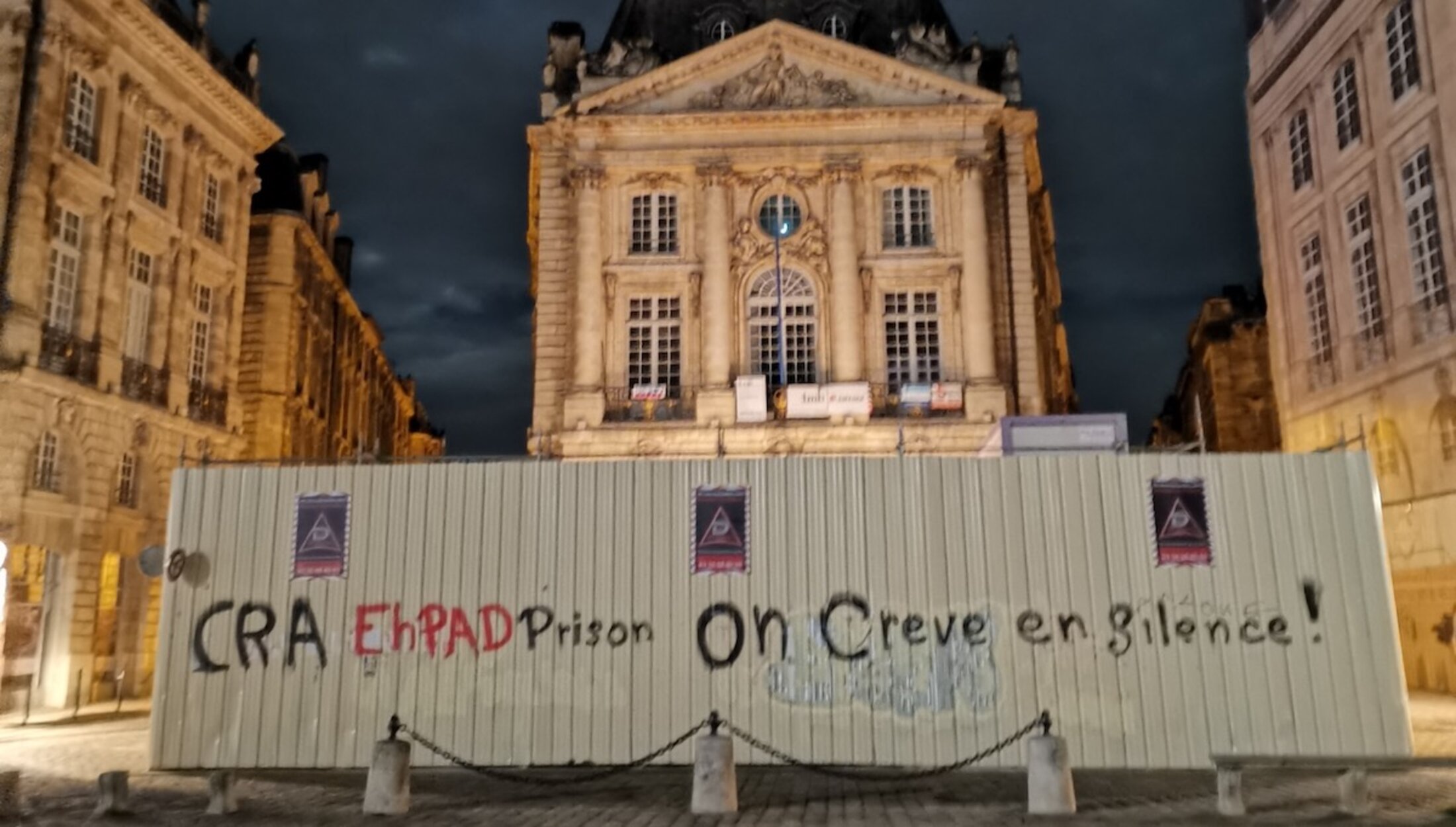 Une photo me parvient par courriel. Place de la Bourse, à Bordeaux, de nuit, une nuit particulière, celle d’hier, celle que les astronomes appellent « super lune », quand notre sage satellite a la curieuse d’idée de s’approcher au plus près de notre folle planète (le phénomène porte un nom, joli : « au périgée de son orbite », enseigne Science et Avenir, le confinement fournit de ces lectures surprises tout de même). Sur le cliché, c’est Bordeaux la Belle, avec ses immeubles qui en imposent, et ses pavés qui nous disposent, la place le plus touristique de la ville, face au miroir d’eau, point de départ des mois durant des Gilets jaunes et des coups de matraques des hommes de Didier Lallement (avant d’être préfet de police de Paris, Lallement officiait ici et lors de sa nomination en ville, Alain Juppé lui-même, baron local, avait eu ces mots à en croire Le Monde : « alors, comme ça, il paraît qu’on m’envoie un nazi ? »). Au centre de la place, des palissades de travaux et, rouge et noir, la photo immortalise ce graffiti de l’instant : « CRA, Ehpad, Prison : on crève en silence ! »
