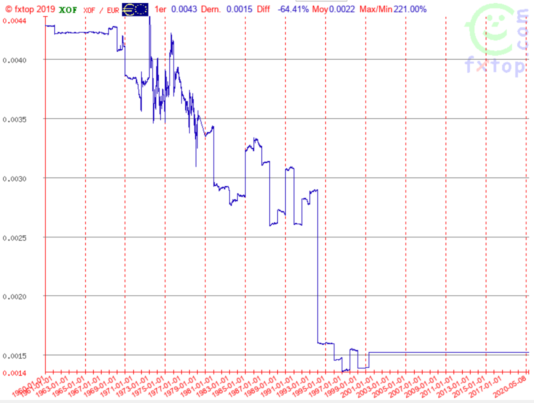 — D'un terrier à l'autre, comme je te l'ai déjà dit. Ce point final, c'est le lien silencieux de la courbe du début et son miroir. Le franc CFA est lié avec l'euro depuis le franc, puisqu'il est désabusé depuis longtemps. Finalement, il continue de l'être à un niveau international et ceci, car il a été propulsé comme vecteur de volatilité sur la bourse international. Regarde ceci :