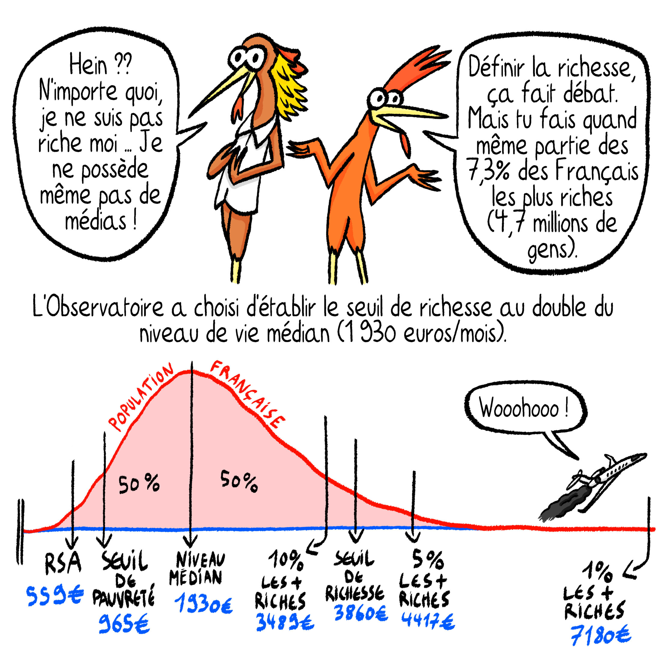 Pour calculer le seuil pour un couple, l’Observatoire fait comme l’INSEE pour le seuil de pauvreté. Le premier adulte vaut une part, tout autre membre du ménage de plus de 14 ans vaut 0,5 part, de moins de 14 ans, 0,3. En famille, on fait des économies d’échelle : on paye un même loyer, une même facture d’électricité, etc. Seuil de richesse pour un couple, un ado et un bébé : 3 860 x 2,3 = 8 878.