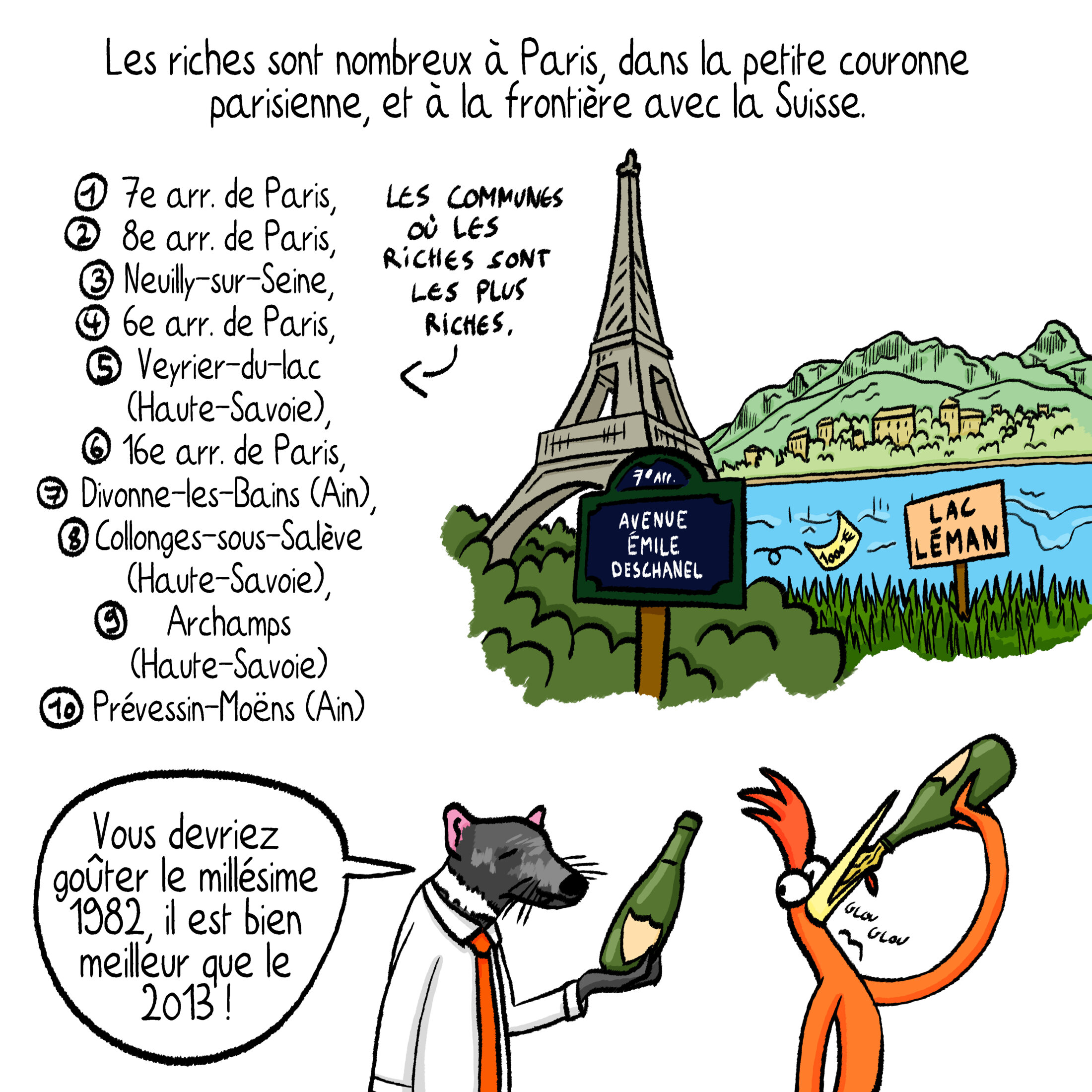 Concernant les communes les plus riches, l’observatoire les divise en deux catégories (grandes et petites villes) mais on a tout regroupé. L’idée, c’est de classer les villes selon le niveau de vie mensuel minimum des 10% les plus riches. On obtient ainsi 12 423 euros mensuels minimum pour le 7e arr. de Paris, 8 528 à Prévessin-Moëns.