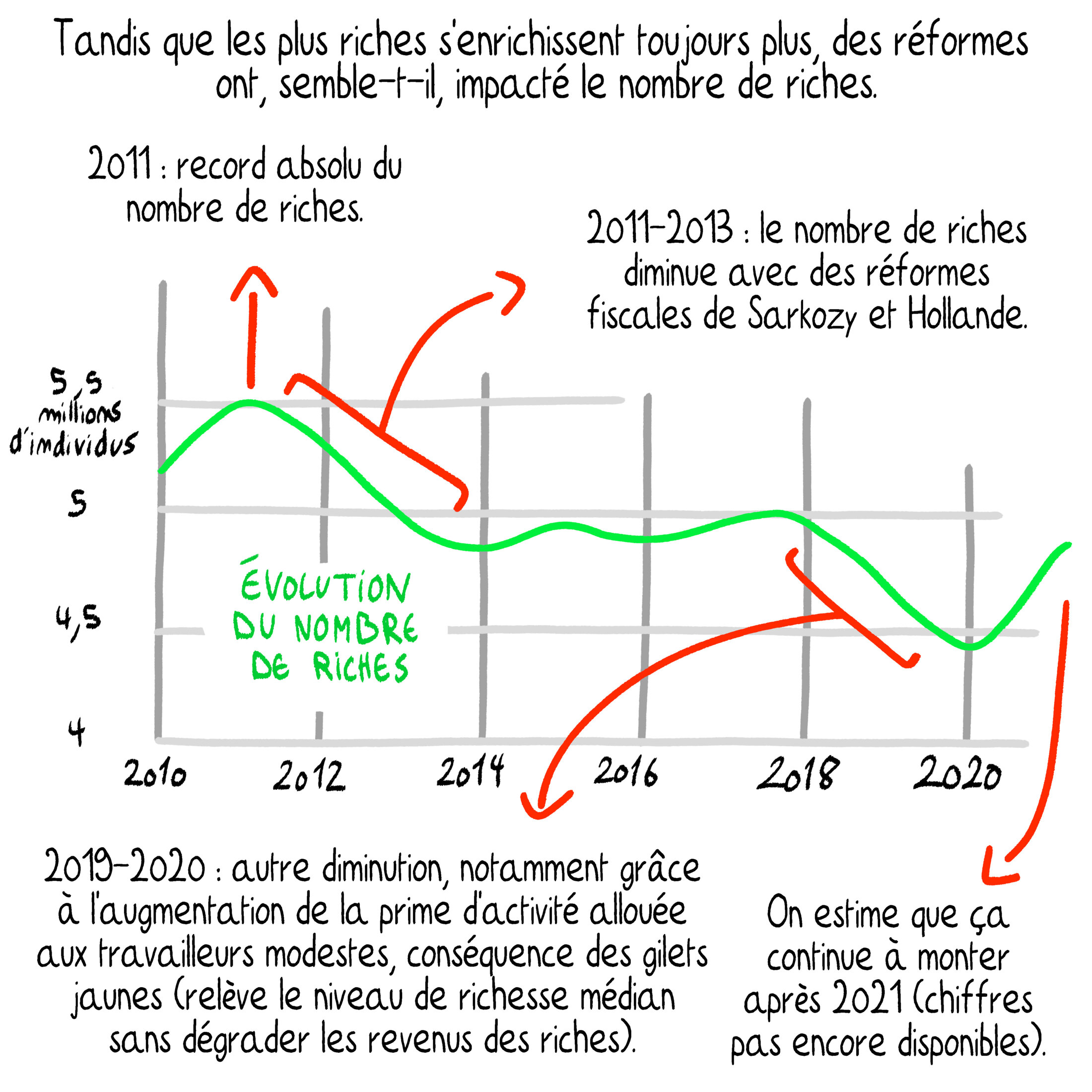 Les réformes fiscales qui auraient impacté le nombre de riches entre 2011 et 2013 : progressivité de l'impôt sur le revenu (barème et taux marginal), plafonnement du quotient familial, prélèvements sur les dividendes et revenus financiers (remplacement du prélèvement forfaitaire libératoire par l'intégration dans le barème de l'IR), limitation des niches fiscales.