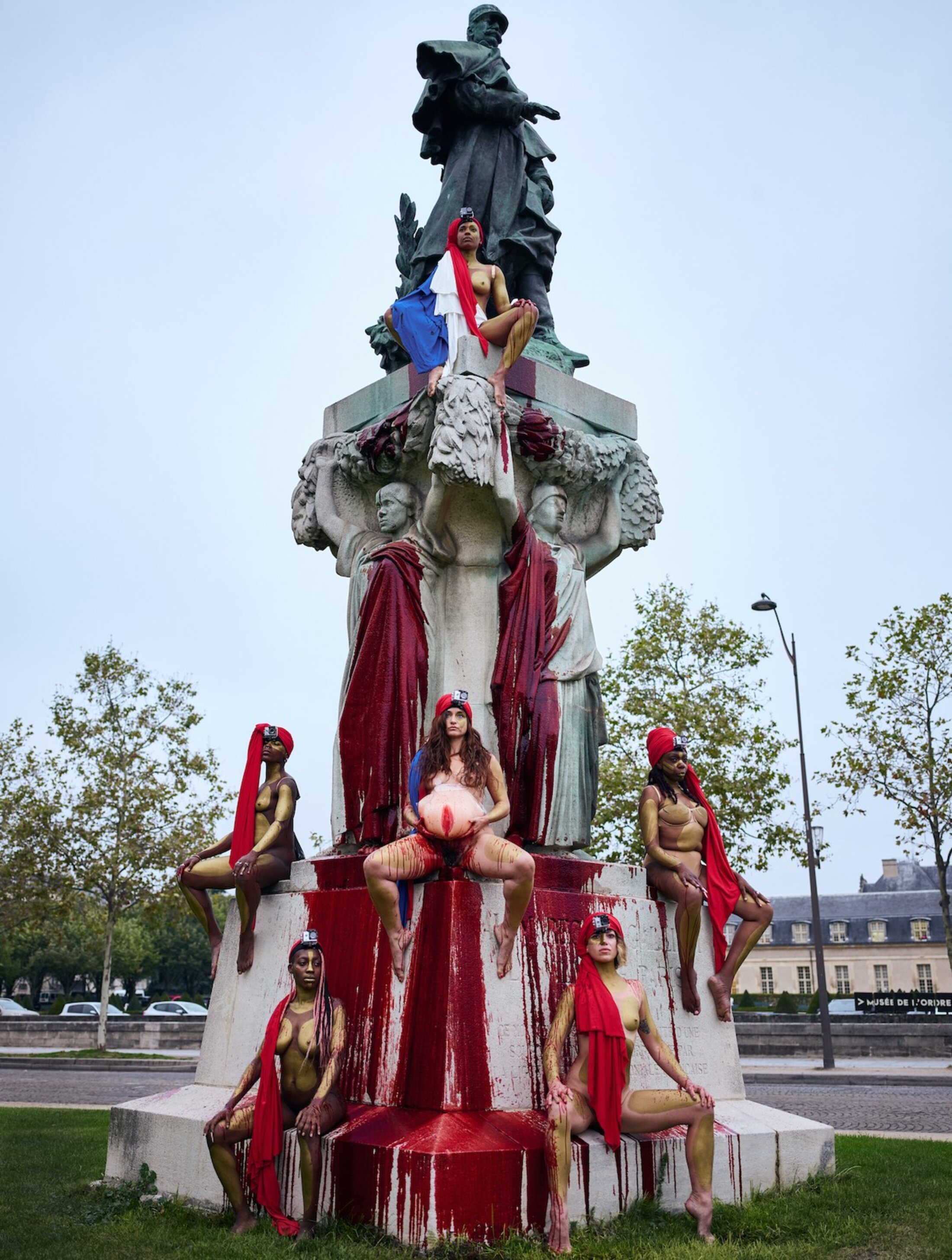 A la première heure du jour, six Mariannes reprennent possession de l’Histoire, ébranlent le pouvoir. Le corps souillé reprend ses droits. Le colon est déchu de l’Histoire, les Mariannes lui tournent le dos et violent son effigie. La statue place Vauban, exhibant vulgairement son architecture phallique, est la représentation du Patriarche : il s’agit d’un colon qui utilise littéralement 4 femmes comme piédestal pour exhiber impunément son crime.