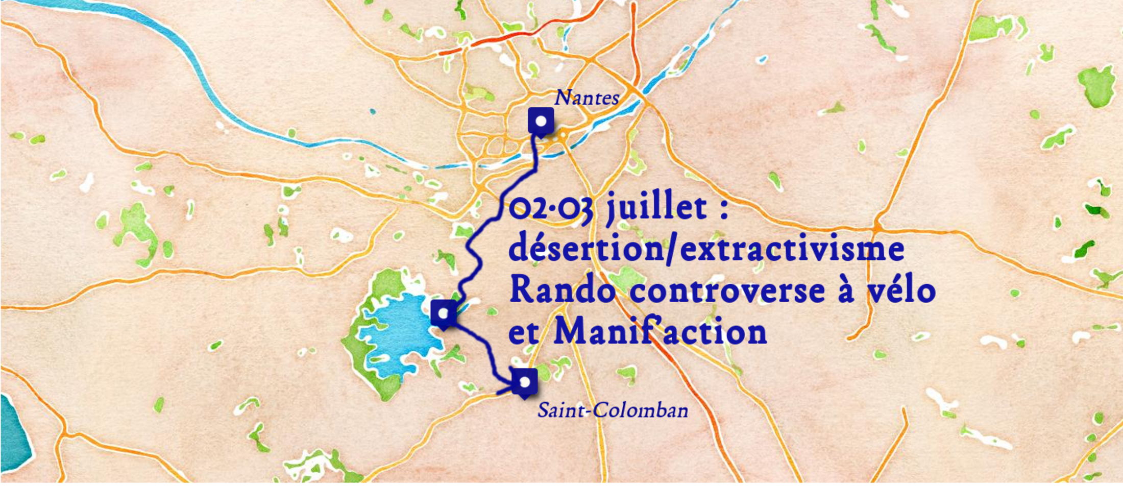 Au cours de cette rando-vélo, (30km) on vous proposera des axes de discussion pour les premières étapes, puis on verra ensemble comment continuer. On sera suivi.e.s d'une voiture pour mettre nos sacs avec notamment les tentes et les duvets. On devrait arriver au lieu dit Le Redour à Saint-Colomban en fin d’après midi / début de soirée, où l'on partagera un repas et on campera. Dimanche matin, nous continuerons la discussion sur les suites possibles après l’été. Puis, nous pourrons rejoindre la journée des Soulèvements de la Terre avec à 11h le village des alternatives, et à 14h la manif'action.