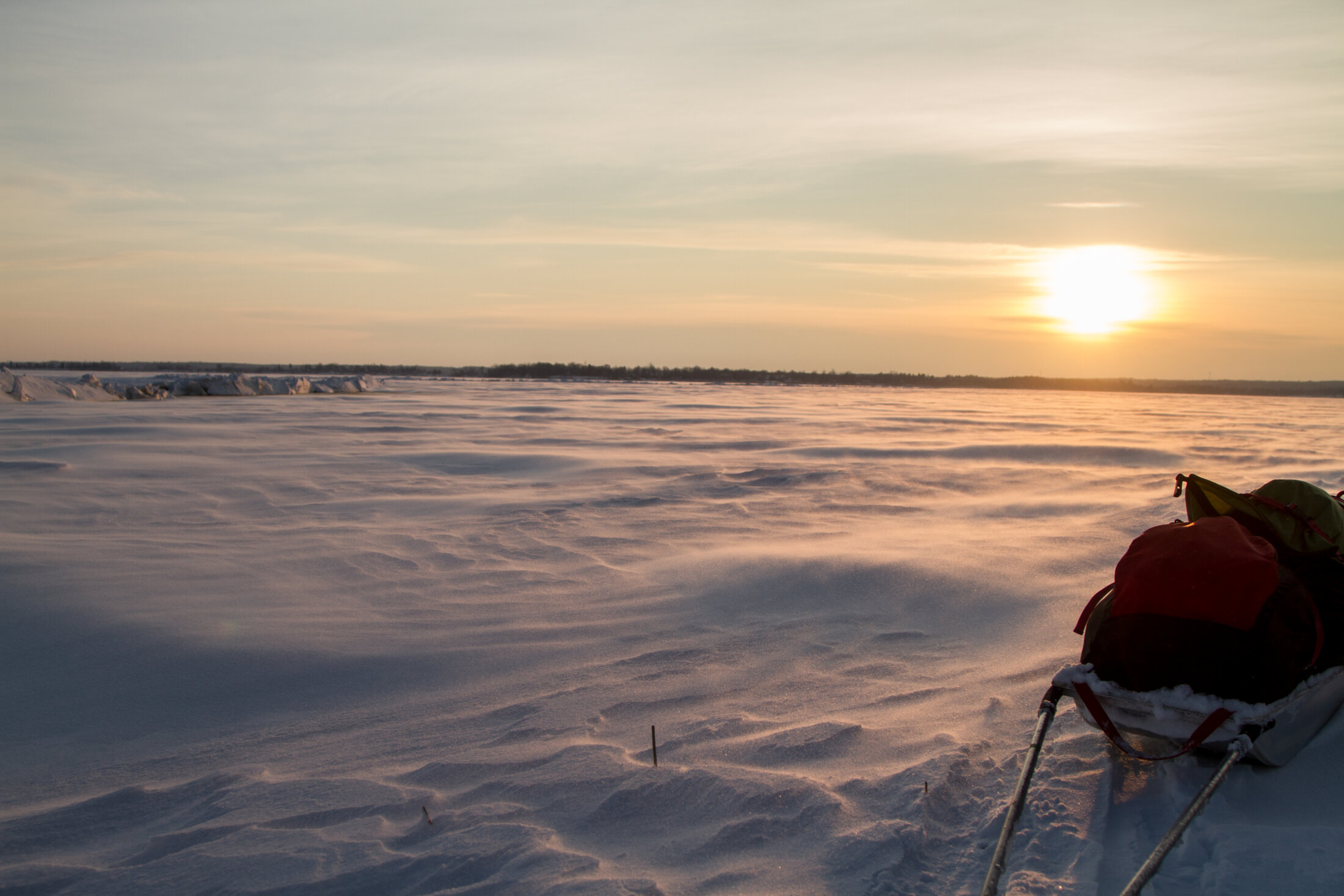 Pour débuter dans mon itinérance, j’emprunterai sûrement la piste de motoneige qui constitue l’épine dorsale de la région, qui n’est plus accessible par bateau en hiver. Une fois un peu plus sûr de mon fait, je tracerai ma route, me laisserai sans doute aussi le loisir de passer quelques jours sans bouger pour établir un camp, faire du feu, réfléchir et lire. Au fond de ma pulka, j’ai serré quelques livres de papier, pour éprouver un peu le poids des mots et de la culture et surtout ne pas céder aux chimères des liseuses, qui peuvent tomber en panne. Il y aura surement Kropotkine, pour L’entraide ; Molière pour Le misanthrope ; de la poésie de Joséphine Bacon et de Noémie Pomerleau-Cloutier ; Serge Bouchard pour son Peuple rieur ; Jean-Jacques Simard et La réduction ; des mots d’innu dans mon carnet pour me délier la langue et puis La horde du contrevent et les nouvelles d’Alain Damasio, pour me souvenir du monde que j’ai laissé quelques temps derrière moi. Une charge supplémentaire certes, mais qui ne me pèsera pas. Il n’y aura pas de record, tout cela n’a pas d’importance quand on est pas pressé. Et puis du temps, justement, j’en ai. Si l’envie d’avancer plus vite me prenait, je confierai mes livres à qui m’offrira de les garder, et les récupèrerai au retour ou les laisserai à celui qui voudra les conserver, pour les lire, caler un meuble ou allumer un feu.