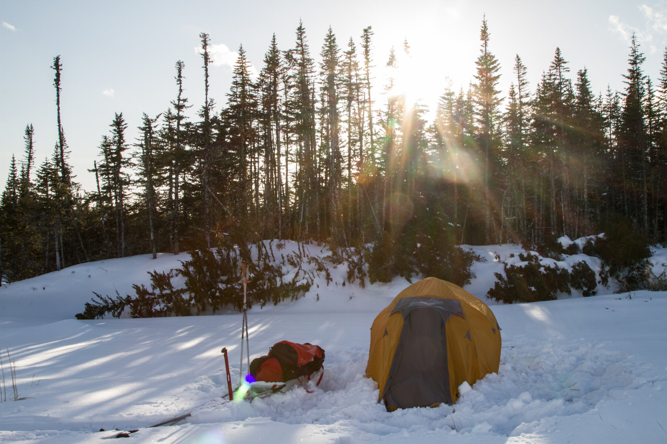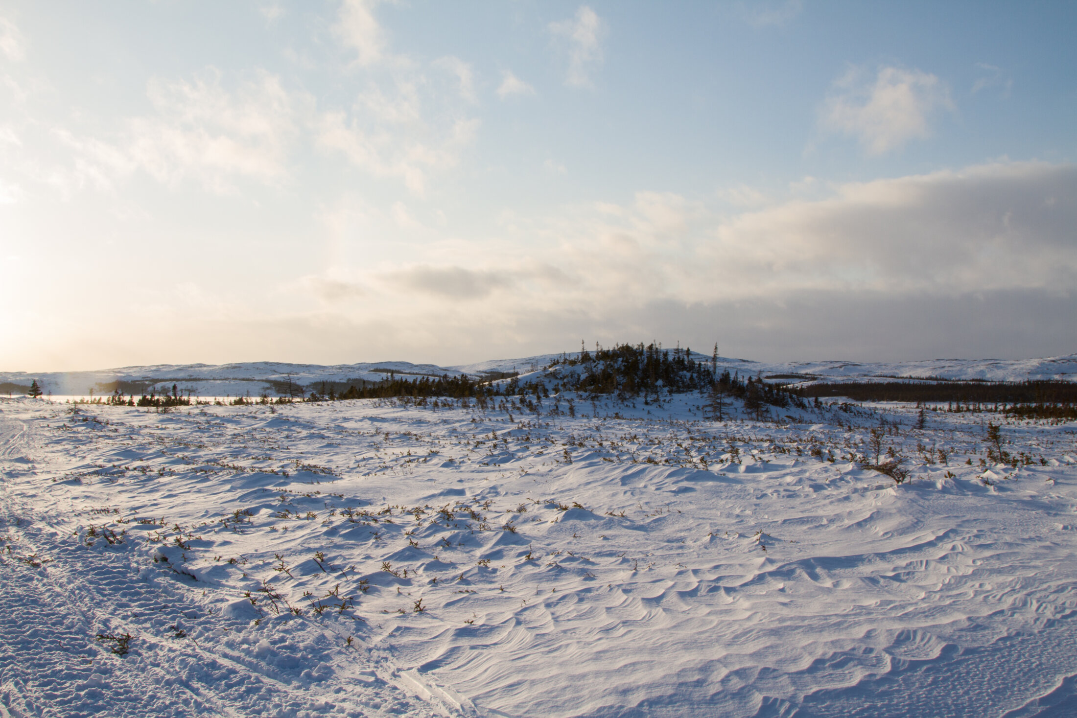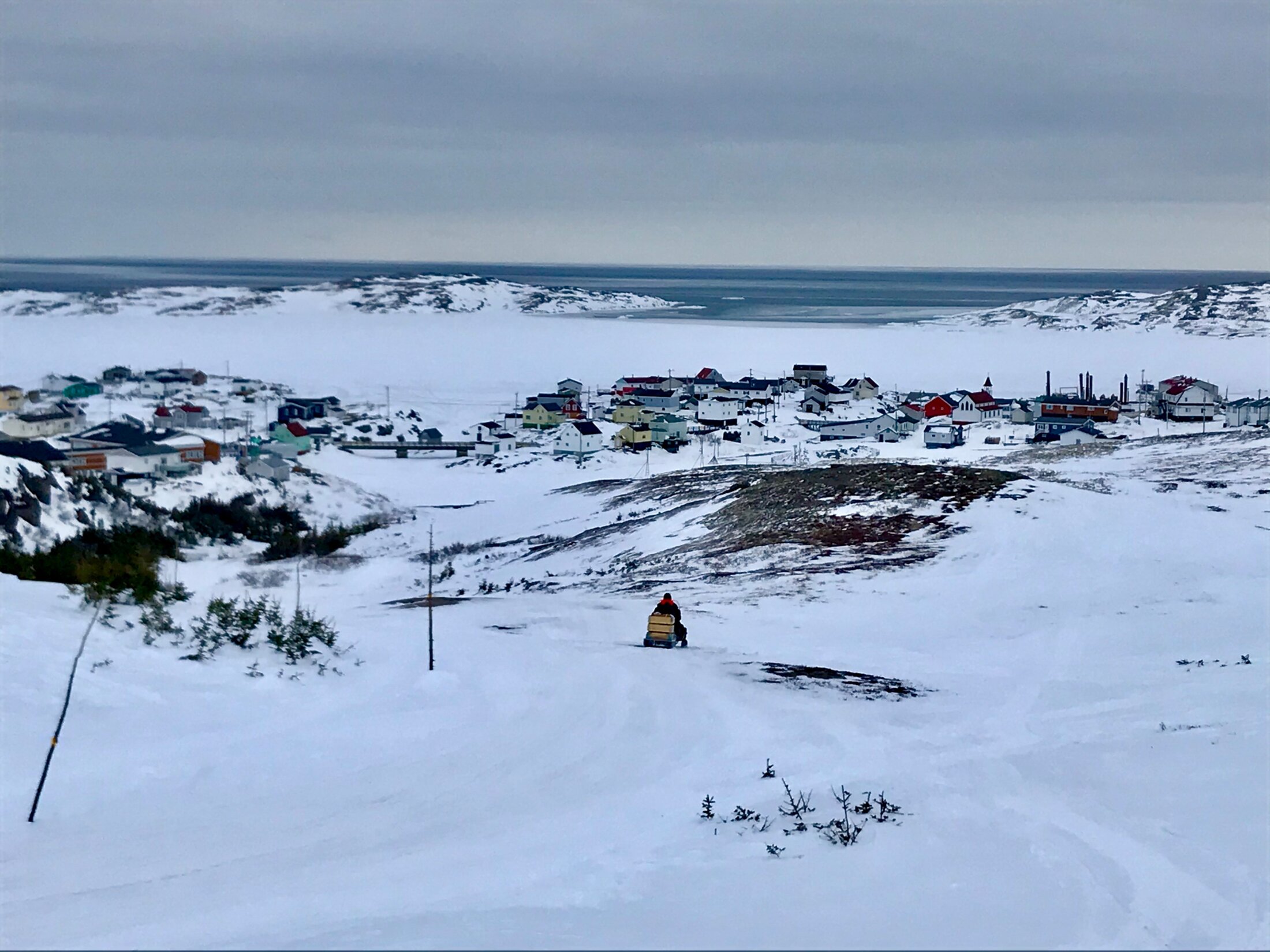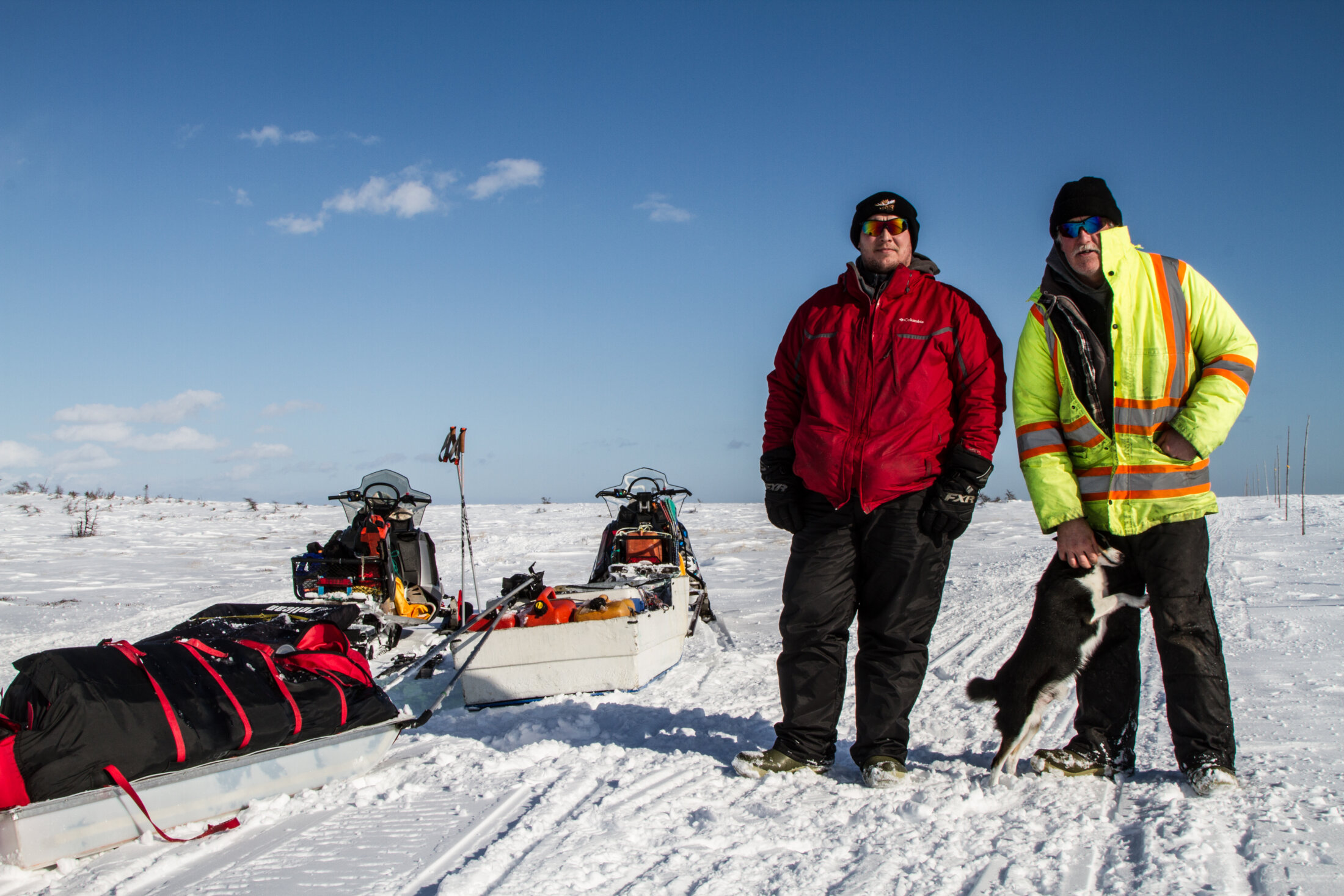 24 heures plus tard, me voilà sous la tente et toujours content. J’ai parcouru 56 kilomètres aujourd’hui, dont 14 sur une motoneige. À cause de mes pieds qui saignent et suintent de nouveau, j’ai avancé plus difficilement et me suis retrouvé bloqué dans un endroit encaissé à enchainer les portages, une vingtaine de kilomètres avant Chevery. Au pied d’une montée particulièrement raide et déneigée, un père et son fils de retour de la pêche m’ont offert de monter à leur bord et m’ont permis, avec leur petit chien sur les genoux qui semblait s’extasier comme moi du paysage, de passer les dernières montées rocheuses. J’ai parcouru les cinq derniers kilomètres en claudiquant jusqu’à Chevery où j’ai fait la connaissance de Marcus qui m’a invité chez lui pour me servir un délicieux plat de lasagnes surgelées, tandis que je faisais la conversation avec son père Harry Jones. Tous les deux sont de fiers descendants de Gallois, arrivés deux siècles plus tôt à Etamamiou, à une quarantaine de kilomètres au sud. Markus s’occupe de l’entretien de la patinoire de hockey du village, Harry est charpentier et travaille dans la construction. Entre deux bouchées et dans les volutes des cigarettes, je leur ai demandé pourquoi ils aiment vivre là et ce qui les conforte à y rester ? Cette question, je la pose à tous ceux que je croise et qui m’accueillent. La réponse est immuable :