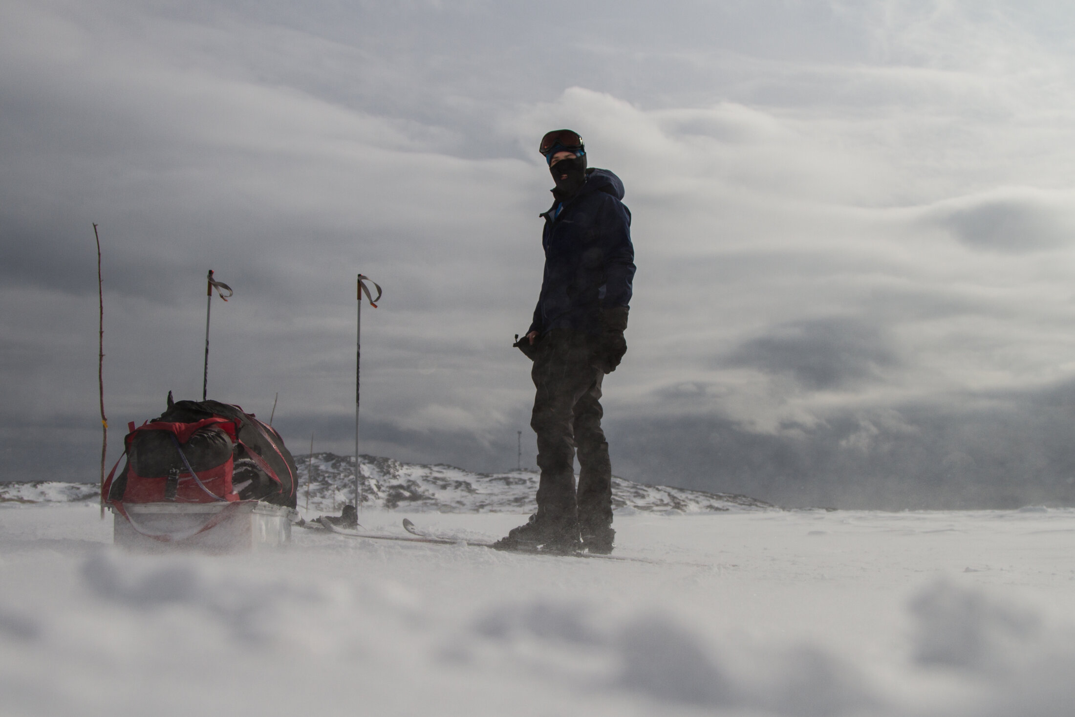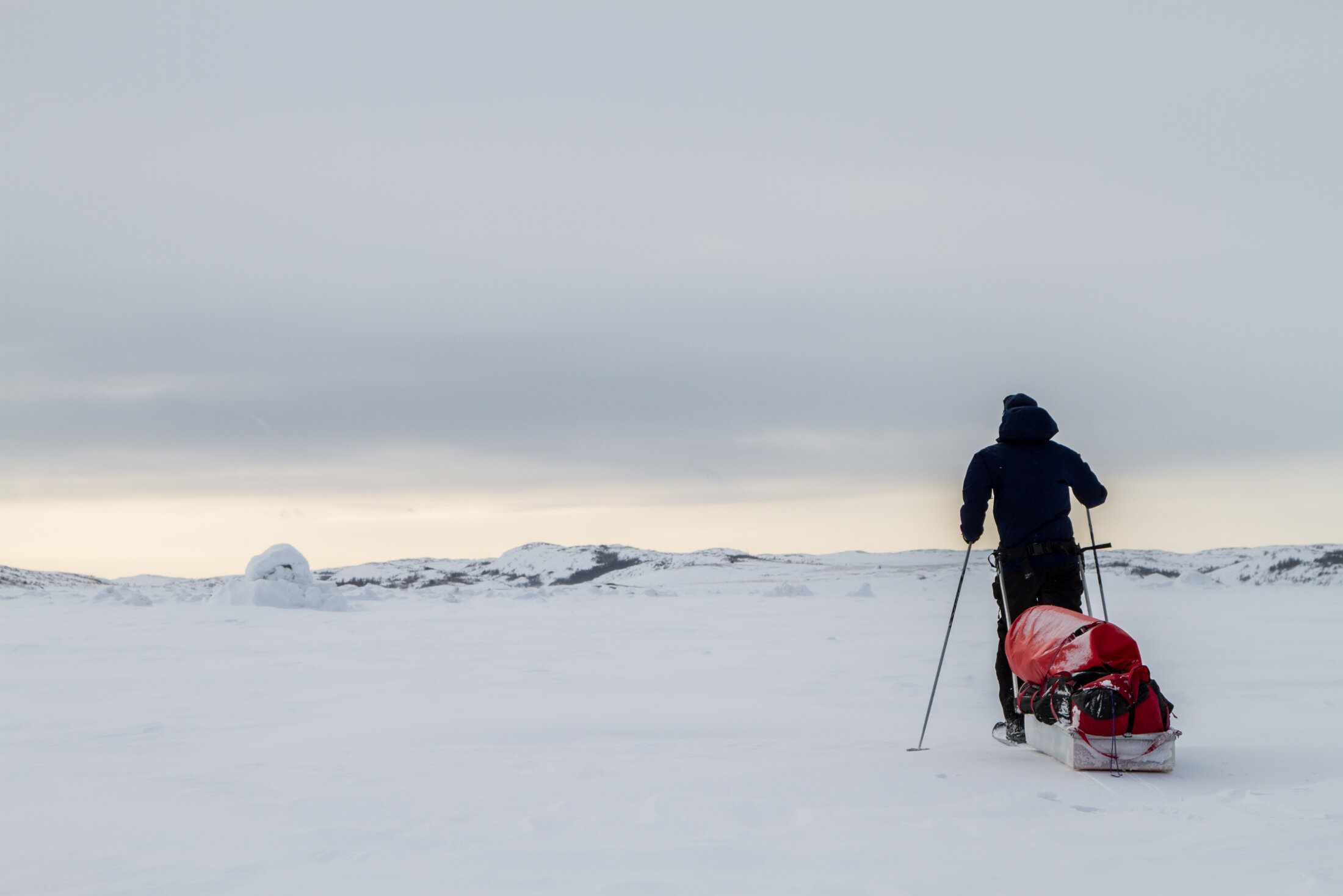 Bon an mal an, j’ai parcouru 22 kilomètres en un peu plus de 3h sans pause, ni pour boire, ni pour manger ; je crois avoir trouvé là mon rythme de croisière. J’ai senti que, dans mes chaussures, la cicatrisation de ces derniers jours commençait à s’effeuiller, mais je n’y ai plus pensé, trop occupé à mastiquer mes pains au lait et à boire du thé. Je ne me suis pas arrêté trop longtemps. Il faisait frais et j’avais encore 26 kilomètres à parcourir. Dix minutes plus tard je suis donc reparti, après avoir pris la décision de ne plus rentrer dans les abris que je croiserai sur ma route. Je resterai dehors assis sur ma luge, qu’importe le temps qu’il fera. M’arracher d’Unamen Shipu a déjà été difficile, je ne dois pas m’en rajouter. Le confort est dangereux pour ce genre d’équipée, on se ramollit vite sous une douche chaude et le cul sur un fauteuil confortable. Or moi, j’ai besoin d’être solide. Passer un moment agréable lors de mes étapes, j’en ai besoin pour prendre le temps nécessaire pour parler avec mes hôtes, mais une fois sur la route je me dois de garder une discipline. Je n’y prends guère de plaisir : manger une barre de céréale quand il fait -15 °C, sans compter le vent, alors qu’une petite cabane vous tend les bras à quelques mètres, n’est pas un moment particulièrement jubilatoire. Pour autant, j’ai pesé le pour et le contre sur le terrain, et la souffrance mentale est moindre en restant dans l’environnement extérieur qu’en tentant de lui grappiller quelques minutes de répit. Répit illusoire car, de toute façon, je vais devoir sortir de mon abri et il n’y a pas grand bienfait à faire le yoyo entre le chaud et le froid. Si je me retrouve congelé sur la route ou que je souffre trop du froid, ce sera une toute autre affaire et je reverrai mon modus operandi ; mais pour l’instant, tout va bien et je me sens à l’aise dans les conditions offertes jusque-là.