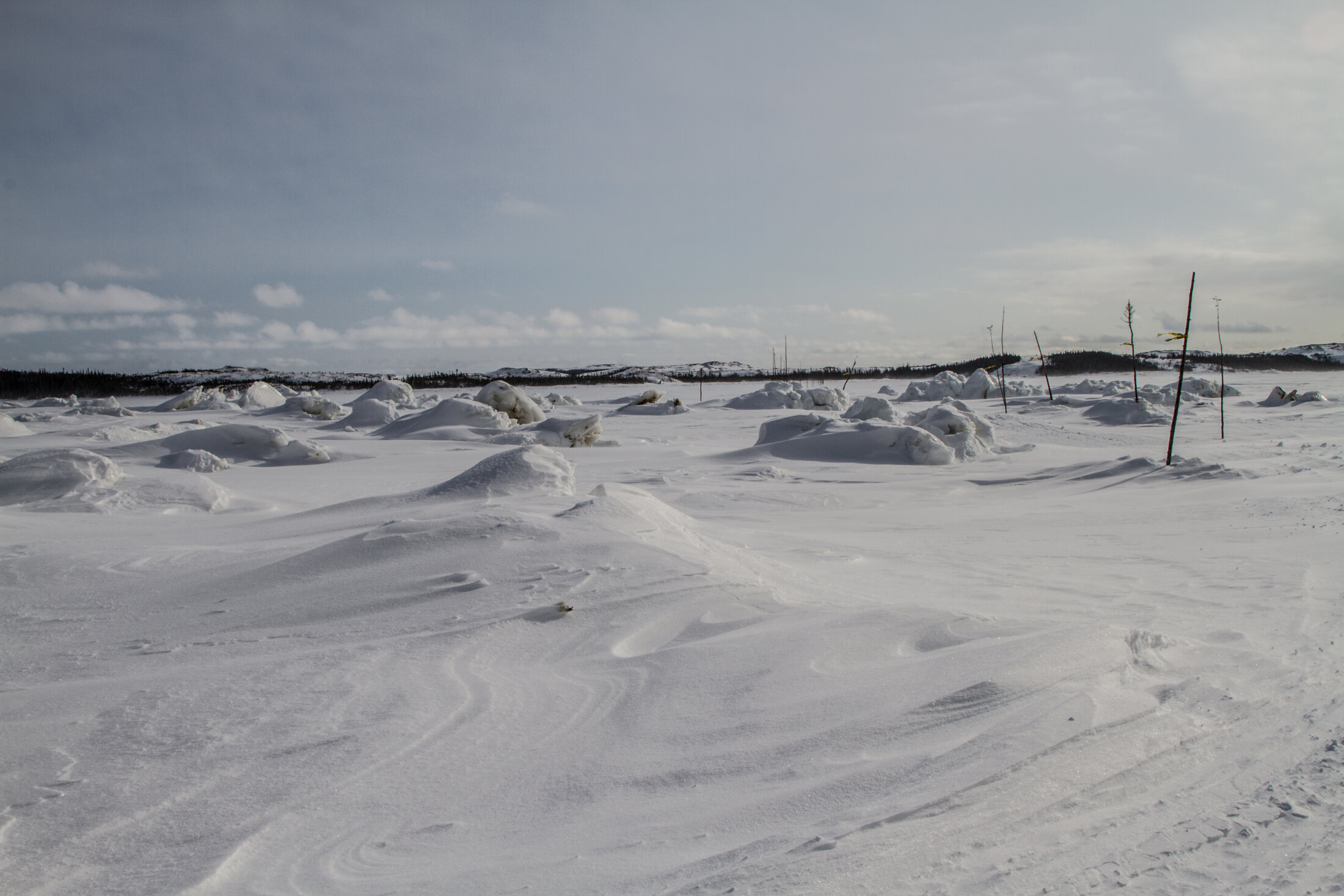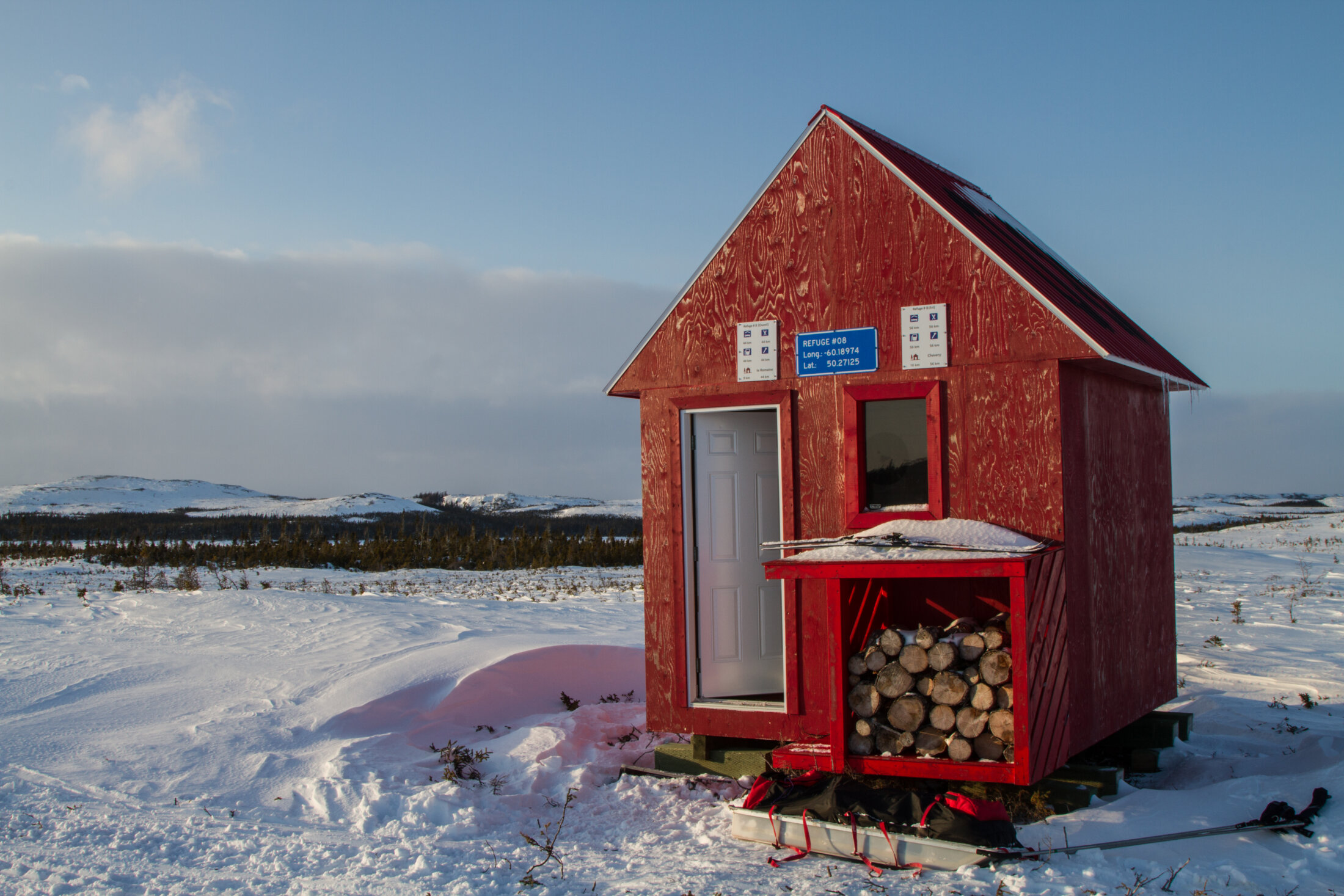 Le thé infuse sur le poêle qui crépite. Dehors, les bourrasques frappent la coque en bois du chalet où je me trouve. Je suis euphorique. Est-ce le morceau de gâteau au chocolat que je me suis gardé pour les grandes occasions ou simplement le plaisir d’être de nouveau sur la piste qui me fait sourire comme un benêt ? Peu importe, je déguste ces moments de vraies joies. 48 kilomètres parcourus aujourd’hui, mais étrangement, je ne sens pas la fatigue. J’ai quitté aux petites heures Unamen Shipu dans le vent et la neige, traversant le village en compagnie de quelques chiens qui ont aboyé pour le principe, puis remué joyeusement la queue sur mes talons, tandis que j'allais le long de l’asphalte qui relie le village à l’aéroport. J’ai marché avec précaution pour éviter à mes spatules de trop souffrir de l’alternance du goudron et de la glace, puis retrouvé la Route Blanche. Le vent de travers et les bourrasques de neiges qui arrivaient à toute vitesse en provenance de la baie avaient achevé de me réveiller. La truffe fraiche et le menton glacé, je riais à gorge déployée.