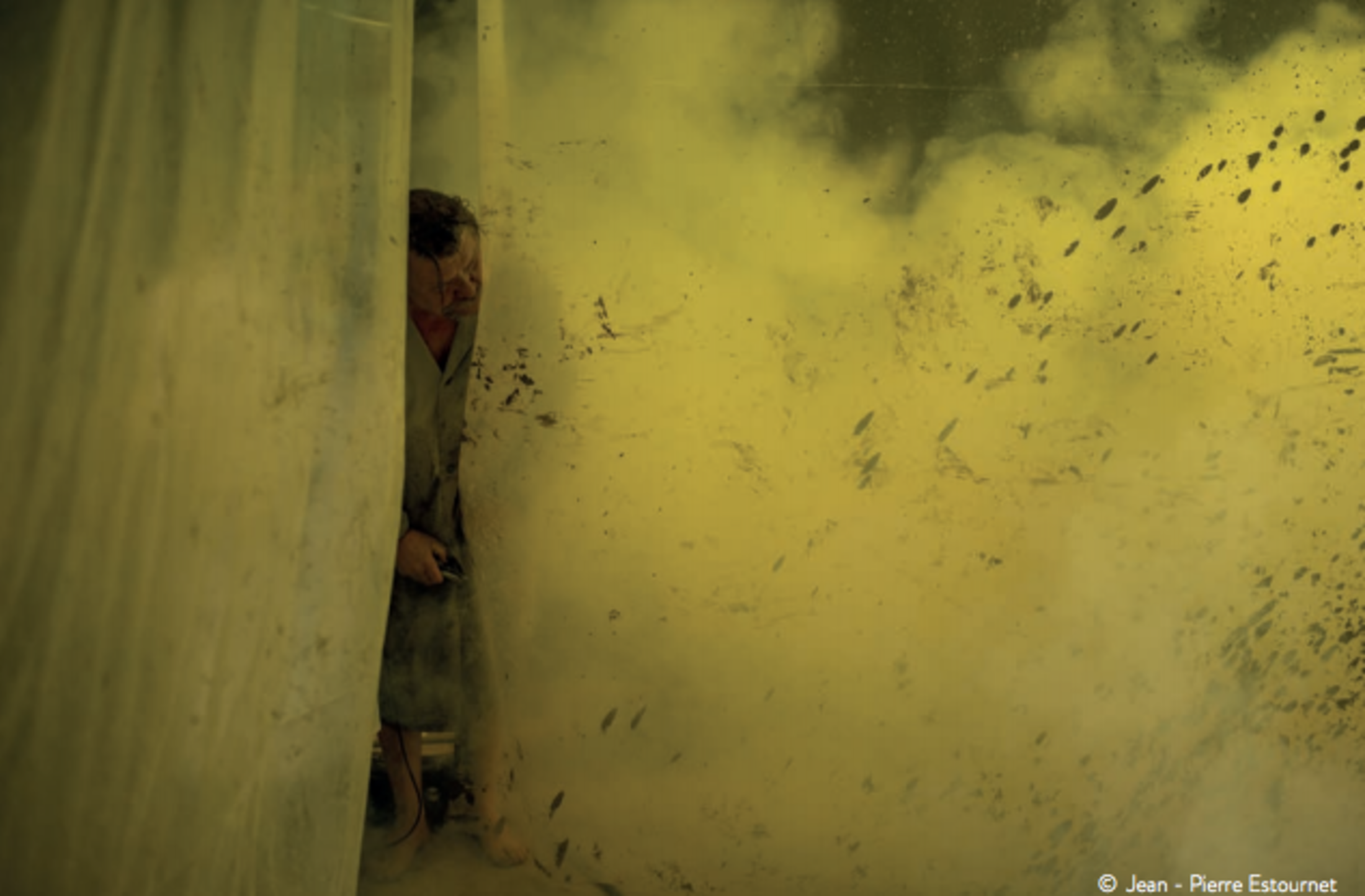 La scénographie du spectacle donne des pistes intelligibles : on a l’impression de regarder une sorte d’espace encombré de tables opératoires, cuve où surnage « LA » matière, lavabo, cage de plexiglass permettant des échanges avec une mystérieuse hiérarchie (aux accents vaguement slaves) qui profère, par micros interposés des ordres ou des recommandations, des consignes figées dans le marbre de leur répétivité. Et pourtant, il n’y a presque rien. Mais il y a ces surfaces à la fois transparentes et opaques – bâches de plastique rigides à peine maculées d’anciennes traces d’expérimentations, aquarium ou sarcophage d’eau trouble. Tout comme la boue est à la fois liquide et solide, la netteté, l’hygiénisme convolent en justes noces avec ce qui finit par vous apparaître – fugacement - comme excrémentiel. Et que viennent renchérir, par intermittence, des voilages de fumigènes augmentant le flou qui semble vouloir régner en Maître. « C’est la brume qui m’a nourri. Depuis des semaines » confie, au final, l’Homme du texte et du film évoqués plus haut, de IONESCO, La Vase.