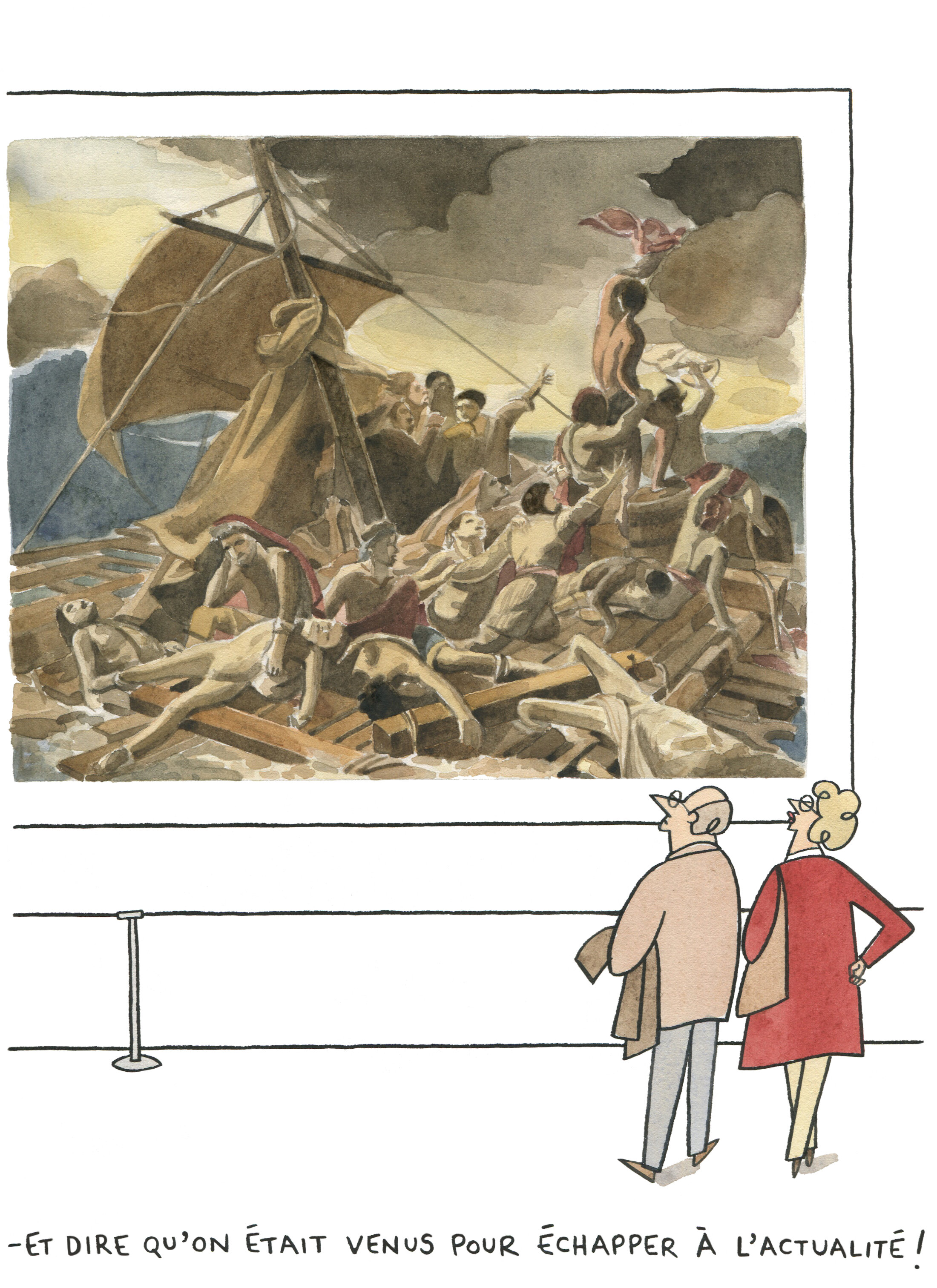 L’un des plus récents est, d'ailleurs, cette trouvaille humoristique sur fond de tableau de GERICAULT: la copie en dessin dudit tableau même miniaturisée est quasi parfaite et l’aspect monumental du tableau qui s’impose aux deux personnages, dûment assumé: