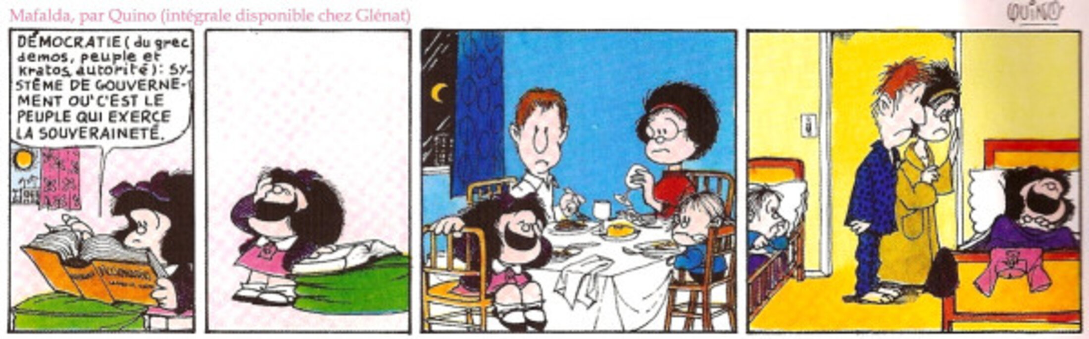 MAFALDA, la jeune héroïne du dessinateur argentin QUINO, en l'un de ses comic-strips imaginés, s'en amuse outrageusement dans les années 60-70 car se souvenant des années de dictature militaire dans son pays.