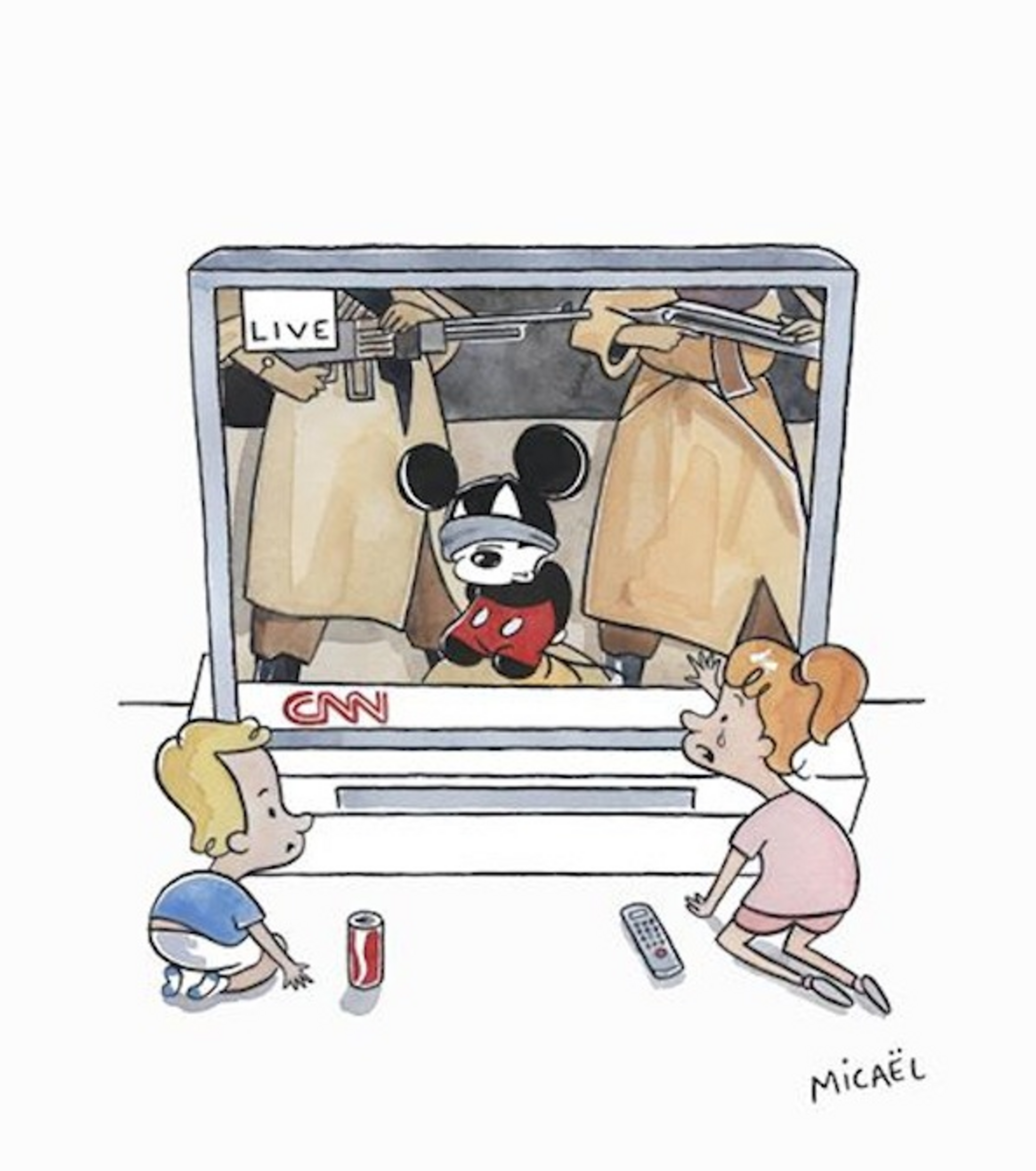 MICAËL fait partie de ces artistes qui ont inventé un univers. Et se défend d’être caricaturiste ou auteur de bande dessinée. Puisque ce ne sont pas des conceptions qui doivent vraiment être, sans nuance, selon lui appariées. Ses planches sont logées dans une seule case au format classique. Et trempent, alternativement, dans le pur noir et blanc ou dans l’aquarelle.