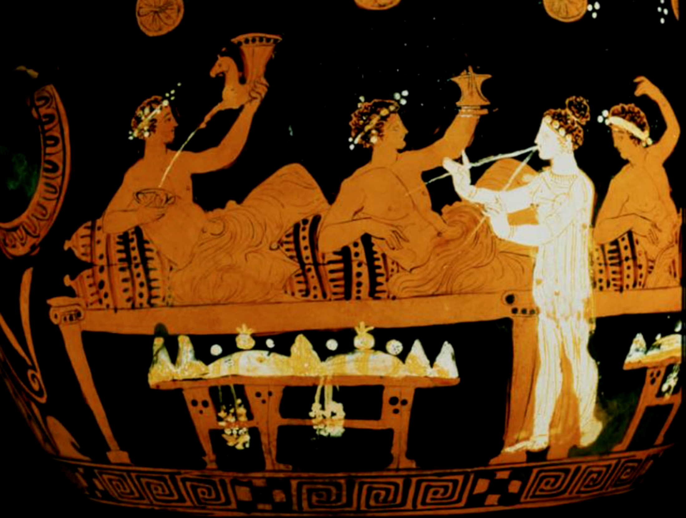 C’est ainsi que Phèdre aligne dans son discours une somme impressionnante de banalités, plus respectueuses à l’égard des mœurs nobiliaires de l’époque que réellement admiratives à l’égard du dieu Amour (il est ancien, il fait autorité, il est noble, etc.). Pausanias se lance ensuite dans une série de distinctions en apparence plus philosophiques puisqu’il est question de deux Amours, l’un noble et l’autre vulgaire, de même qu’on distingue généralement deux Aphrodite, l’une Céleste l’autre vulgaire. Mais là encore il apparaît que la beauté et la noblesse de l’amour sont toujours liées au respect d’une position sociale convenable ; les vertus morales et les règles sociales que Pausanias demande de respecter au nom de l’Amour traduisent la domination d’une aristocratie conservatrice. De plus c’est une conception de l’amour et (surtout) de la sexualité fort éloignée de la nôtre qui est ici décrite. Nous nous représentons habituellement la relation sexuelle sur le mode de la complémentarité homme/femme. Or les anciens grecs la concevaient plutôt sur le mode d’une relation entre le supérieur et l’inférieur (hiérarchie), soit homme/femme, soit adulte/adolescent, soit à la limite homme libre/esclave. C’est ici qu’Aristophane, le célèbre auteur de comédies, devait prendre la parole, mais pris d’une soudaine crise de hoquet (ironie : serait-ce le discours de Pausanias qui ne « passe pas » ?), il cède provisoirement son tour au médecin Eryximaque, lequel tout en reprenant la distinction des deux Aphrodite, va littéralement « noyer » les vertus de l’Amour dans des considérations physiciennes et cosmologiques où il s’agit en toute chose d’établir une juste mesure, un équilibre, une harmonie universelle…