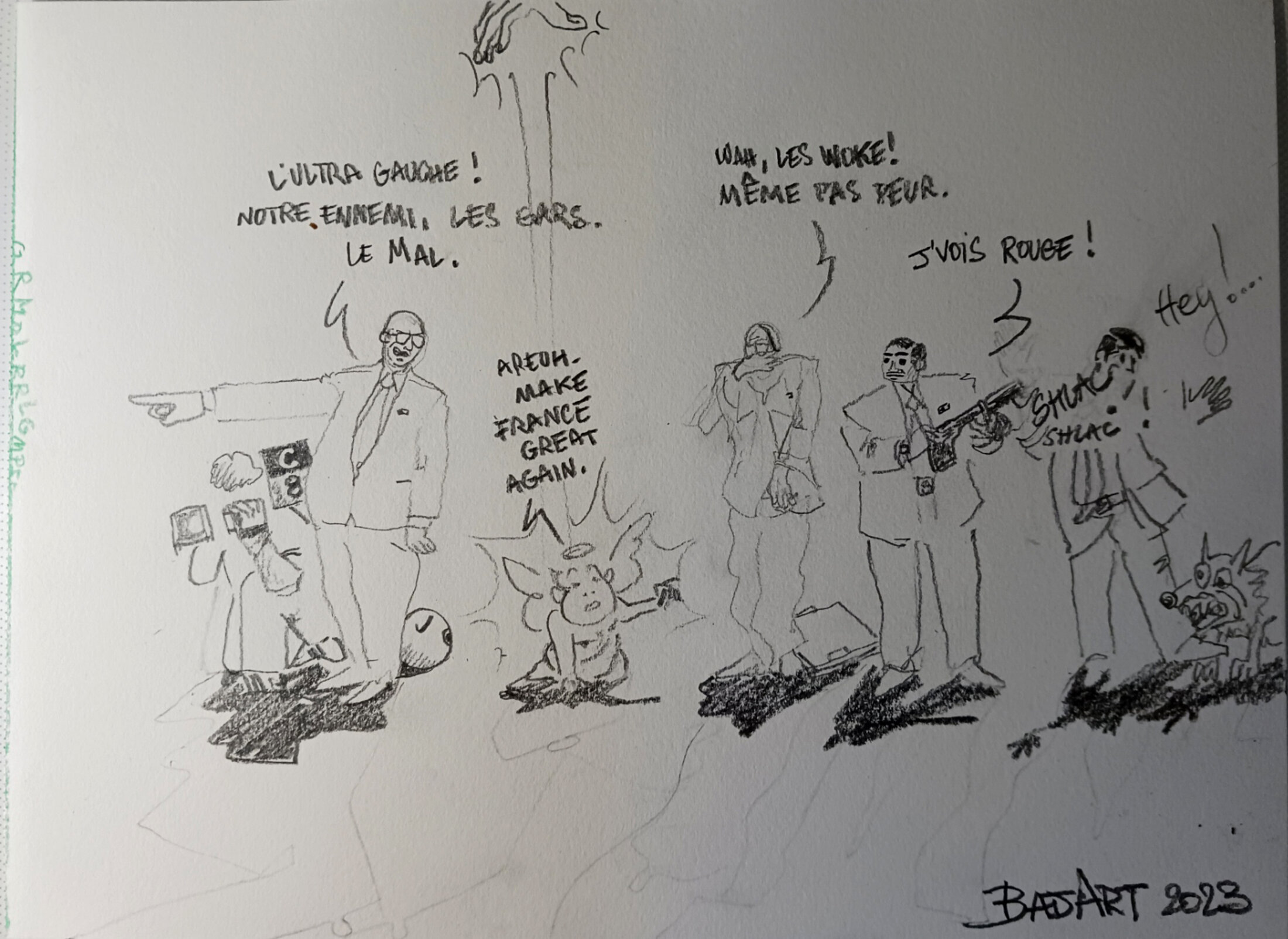 Oh ben, je ne suis pas prête ! je veux dire, prêtre... je veux dire prêt, moi, ouamdé, le BatArt schizo gonflé à bloc d'entendre le mot gauche dans la bouche des fachos. Antifasciste débutant, ceinture jaune de Judo, manieur de crayons et buveur de bière, je n'ai plus rien à dire. A nos planches !