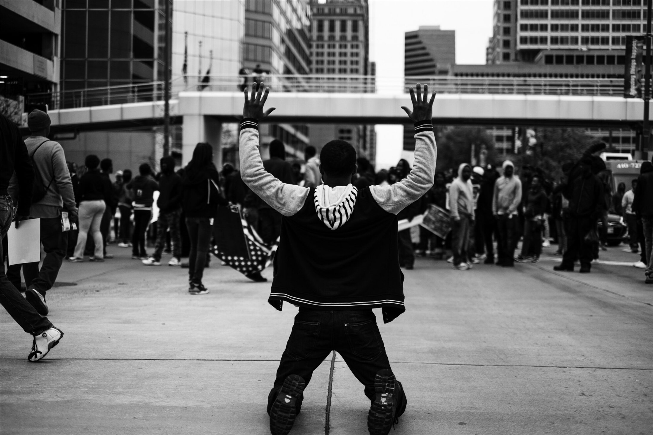 Mais c'est surtout le retournement des stigmates qui illustre avec force la dialectique d'émancipation mise en scène par ces corps en rupture. Mains liées derrière le dos et le torse contre l'asphalte (p. 101), mains levées devant la police (suivant le slogan hands up don't shoot) (p. 57, 80, 111), ou encore genoux à terre et mains levées en position d'arrestation (p. 69): le corps des manifestants met en scène avec insistance le droit d'exister des Africains-Américains face aux forces de l'ordre. La poétique de ces corps, tout comme le slogan Black Lives Matter, réaffirment une humanité sans cesse niée par les pratiques des pouvoirs établis à l'encontre des Africains-Américains.