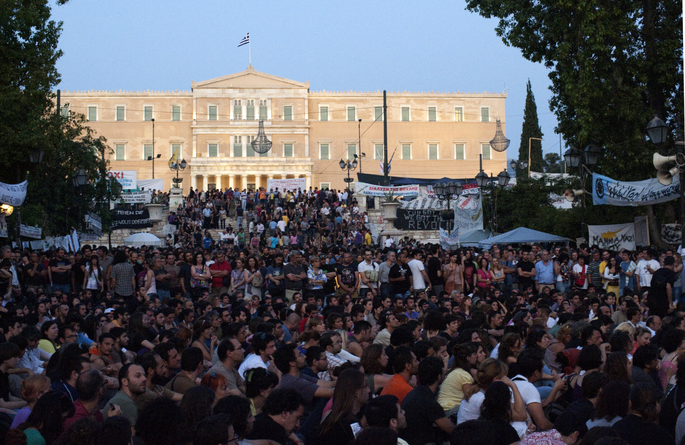 Le communiqué de l'assemblée populaire de Syntagma du 28 juin 2011est ainsi intitulé : « Ils sont condamnés à l’annulation et nous à la victoire ! »[5] En réclamant un audit sur la dette grecque et un moratoire sur le versement des intérêts aux créanciers, le « mouvement des places » tente de politiser une question monopolisée par les « experts » de la classe dirigeante. La question de l'illégitimité politique de la dette et des plans d'austérité a donc été au centre de la victoire électorale de la "Coalition de la gauche radicale" (SYRIZA). Malgré la défaite de cette dynamique politique, symbolisé par le volte-face d'Alexis Tsipras suite au référendum de juillet 2015, pareille démarche est une remise en question frontale des prérogatives de l'oligarchie capitaliste au pouvoir et synonyme d'émancipation politique et sociale pour la majorité.