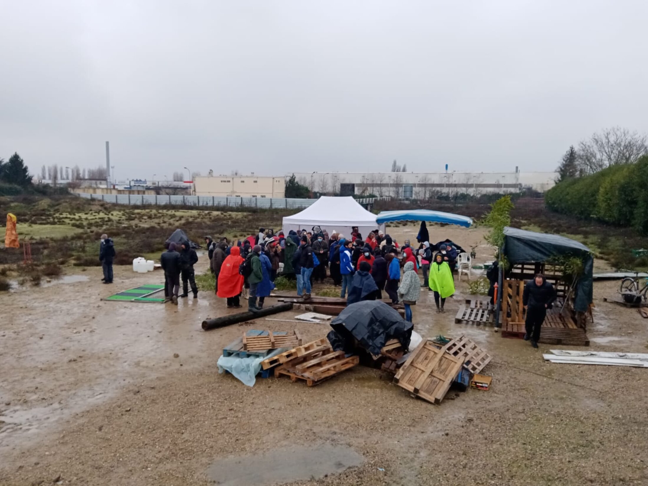Grand jour en ce dimanche 7 février la ZAD est installée sur la zone du chantier de la gare. Nous sommes une centaine venus de partout en France, de Notre-Dame des Landes à la banlieue parisienne. Cette ZAD représente une lutte fédératrice pour tous les collectifs qui déplorent la destruction des espaces verts au mépris de la santé de tous, sous tous les prétextes Grand Paris, JO, spéculation immobilière, développement économique à courte vue.