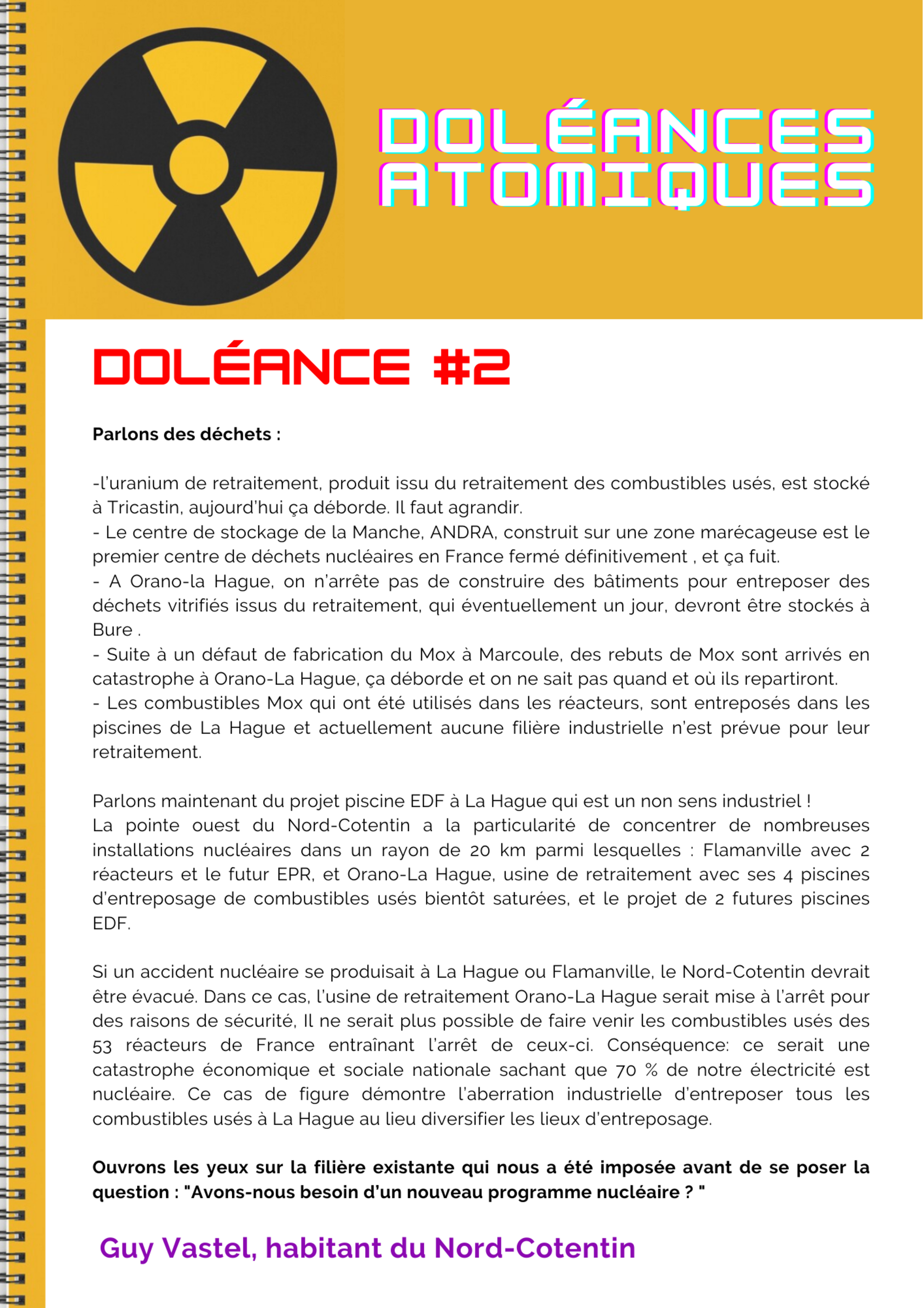 - Suite à un défaut de fabrication du Mox à Marcoule, des rebuts de Mox sont arrivés en catastrophe à Orano-La Hague, ça déborde et on ne sait pas quand et où ils repartiront.