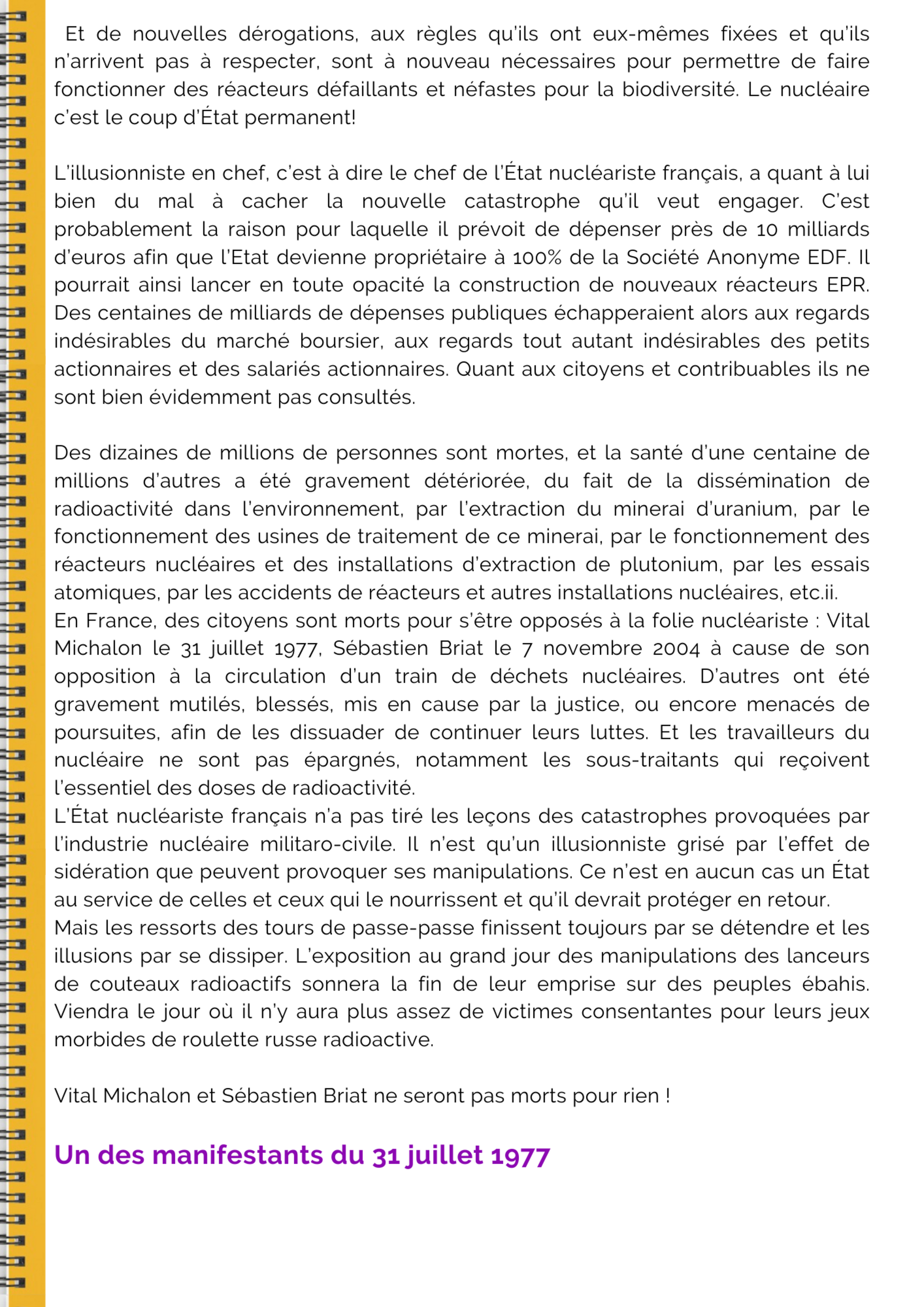 En France, des citoyens sont morts pour s’être opposés à la folie nucléariste : Vital Michalon le 31 juillet 1977, Sébastien Briat le 7 novembre 2004 à cause de son opposition à la circulation d’un train de déchets nucléaires. D’autres ont été gravement mutilés, blessés, mis en cause par la justice, ou encore menacés de poursuites, afin de les dissuader de continuer leurs luttes. Et les travailleurs du nucléaire ne sont pas épargnés, notamment les sous-traitants qui reçoivent l’essentiel des doses de radioactivité.