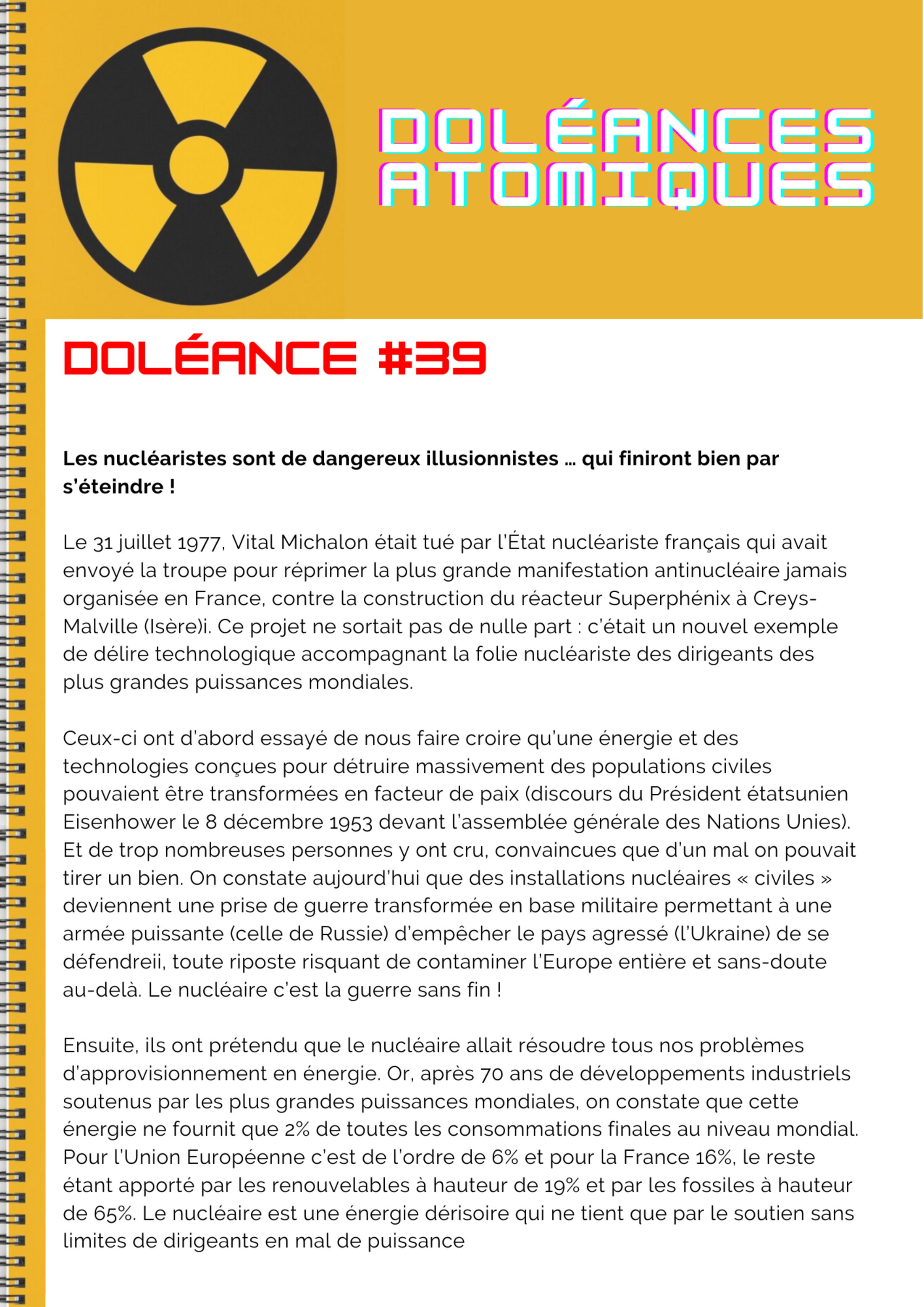 Le 31 juillet 1977, Vital Michalon était tué par l’État nucléariste français qui avait envoyé la troupe pour réprimer la plus grande manifestation antinucléaire jamais organisée en France, contre la construction du réacteur Superphénix à Creys-Malville (Isère)i. Ce projet ne sortait pas de nulle part : c’était un nouvel exemple de délire technologique accompagnant la folie nucléariste des dirigeants des plus grandes puissances mondiales.