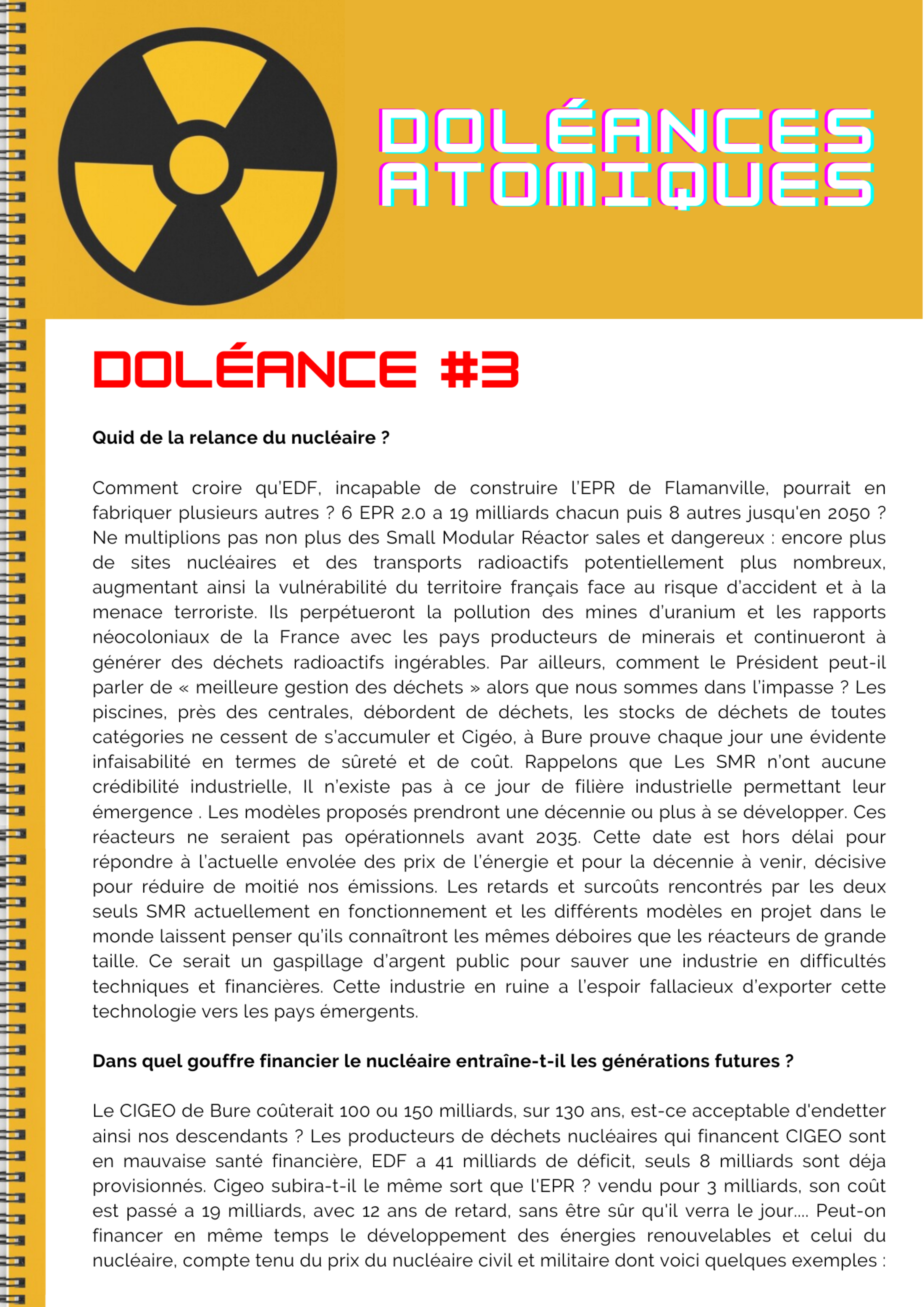 Comment croire qu’EDF, incapable de construire l’EPR de Flamanville, pourrait en fabriquer plusieurs autres ? 6 EPR 2.0 a 19 milliards chacun puis 8 autres jusqu'en 2050 ? Ne multiplions pas non plus des Small Modular Réactor sales et dangereux : encore plus de sites nucléaires et des transports radioactifs potentiellement plus nombreux, augmentant ainsi la vulnérabilité du territoire français face au risque d’accident et à la menace terroriste. Ils perpétueront la pollution des mines d’uranium et les rapports néocoloniaux de la France avec les pays producteurs de minerais et continueront à générer des déchets radioactifs ingérables. Par ailleurs, comment le Président peut-il parler de « meilleure gestion des déchets » alors que nous sommes dans l’impasse ? Les piscines, près des centrales, débordent de déchets, les stocks de déchets de toutes catégories ne cessent de s’accumuler et Cigéo, à Bure prouve chaque jour une évidente infaisabilité en termes de sûreté et de coût. Rappelons que Les SMR n’ont aucune crédibilité industrielle, Il n’existe pas à ce jour de filière industrielle permettant leur émergence . Les modèles proposés prendront une décennie ou plus à se développer. Ces réacteurs ne seraient pas opérationnels avant 2035. Cette date est hors délai pour répondre à l’actuelle envolée des prix de l’énergie et pour la décennie à venir, décisive pour réduire de moitié nos émissions. Les retards et surcoûts rencontrés par les deux seuls SMR actuellement en fonctionnement et les différents modèles en projet dans le monde laissent penser qu’ils connaîtront les mêmes déboires que les réacteurs de grande taille. Ce serait un gaspillage d’argent public pour sauver une industrie en difficultés techniques et financières. Cette industrie en ruine a l’espoir fallacieux d’exporter cette technologie vers les pays émergents.