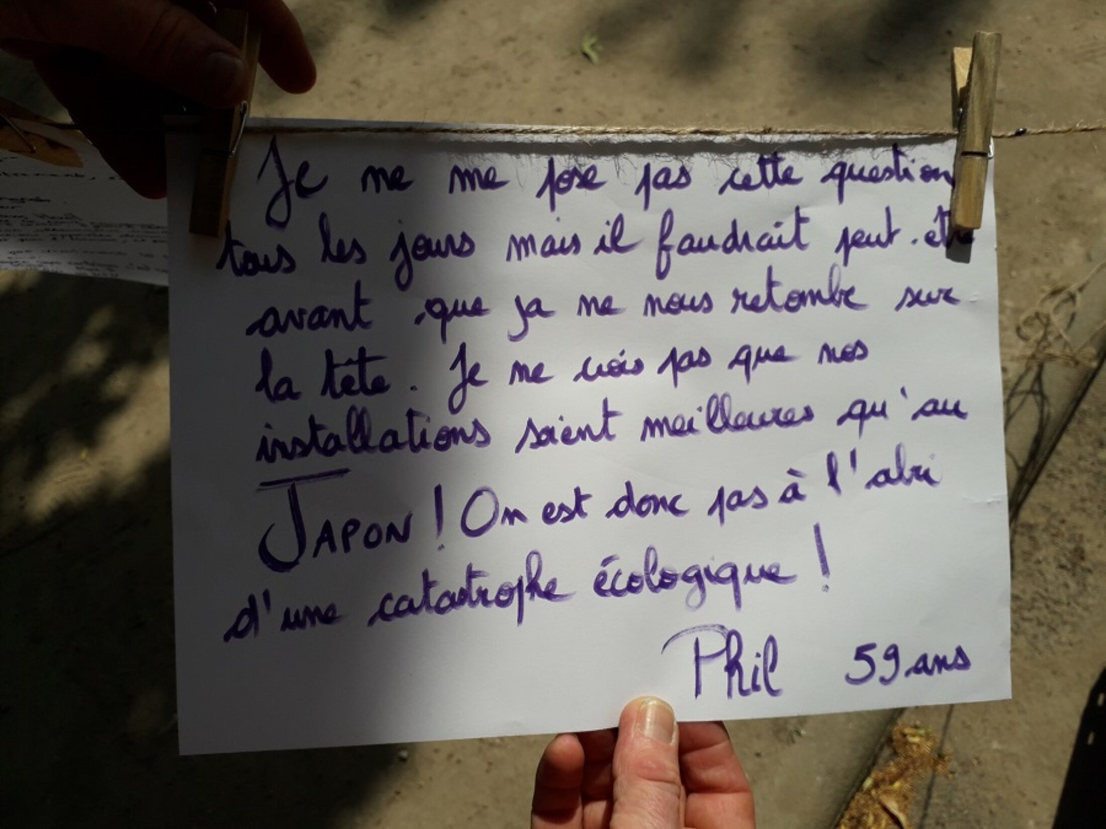 "J'y tiens pas du tout, ça coûte cher, plus cher qu'on ne le croit et cet argent ne nous assure même pas la sécurité!" "Je ne crois pas que nos installations soient meilleures qu'au Japon." Réponses de 2 passants lors d'un portage de parole à Tours sur "La relance du nucléaire, vous la voulez?"