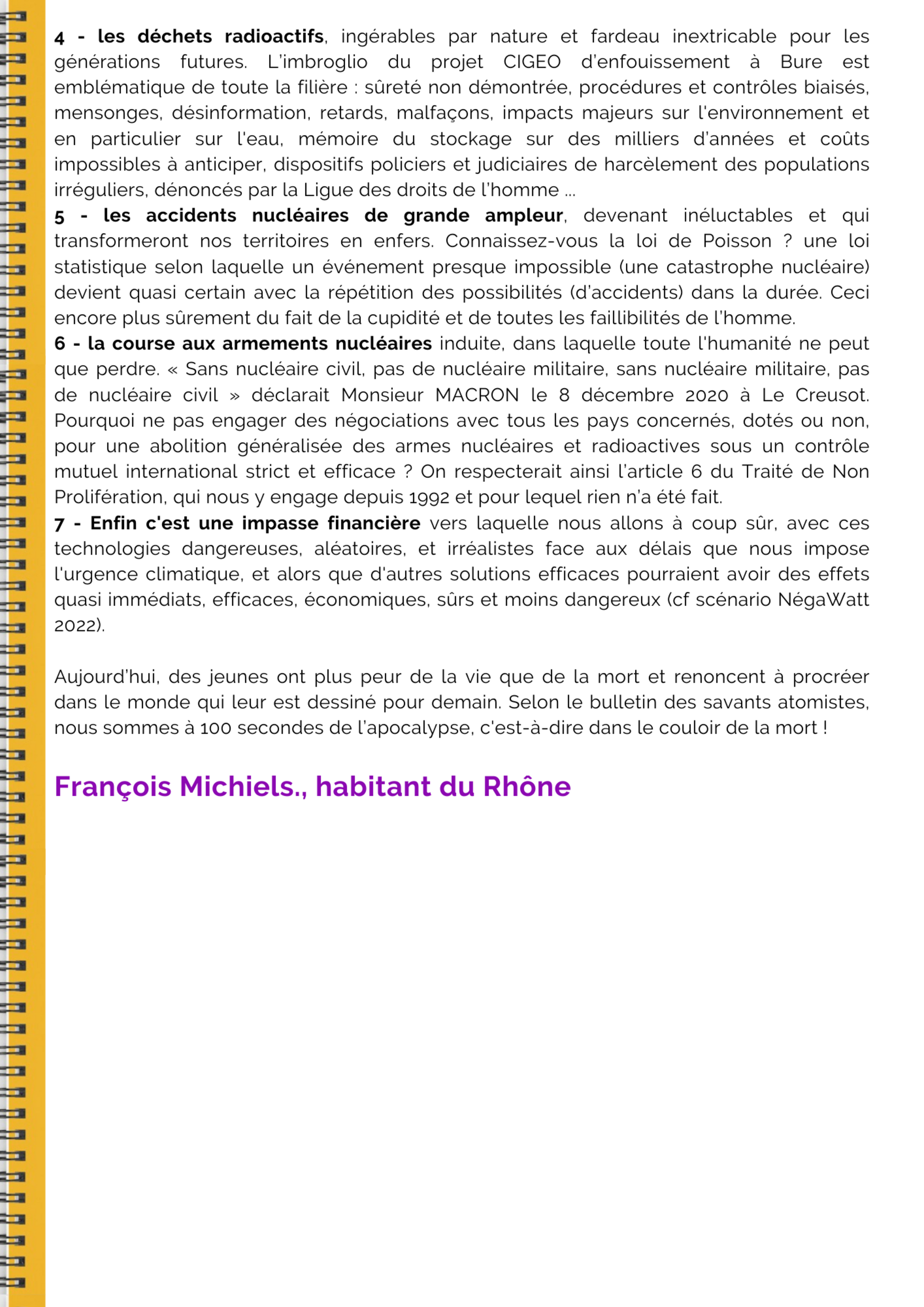4 - les déchets radioactifs, ingérables par nature et fardeau inextricable pour les générations futures. L’imbroglio du projet CIGEO d’enfouissement à Bure est emblématique de toute la filière : sûreté non démontrée, procédures et contrôles biaisés, mensonges, désinformation, retards, malfaçons, impacts majeurs sur l'environnement et en particulier sur l'eau, mémoire du stockage sur des milliers d’années et coûts impossibles à anticiper, dispositifs policiers et judiciaires de harcèlement des populations irréguliers, dénoncés par la Ligue des droits de l’homme ...