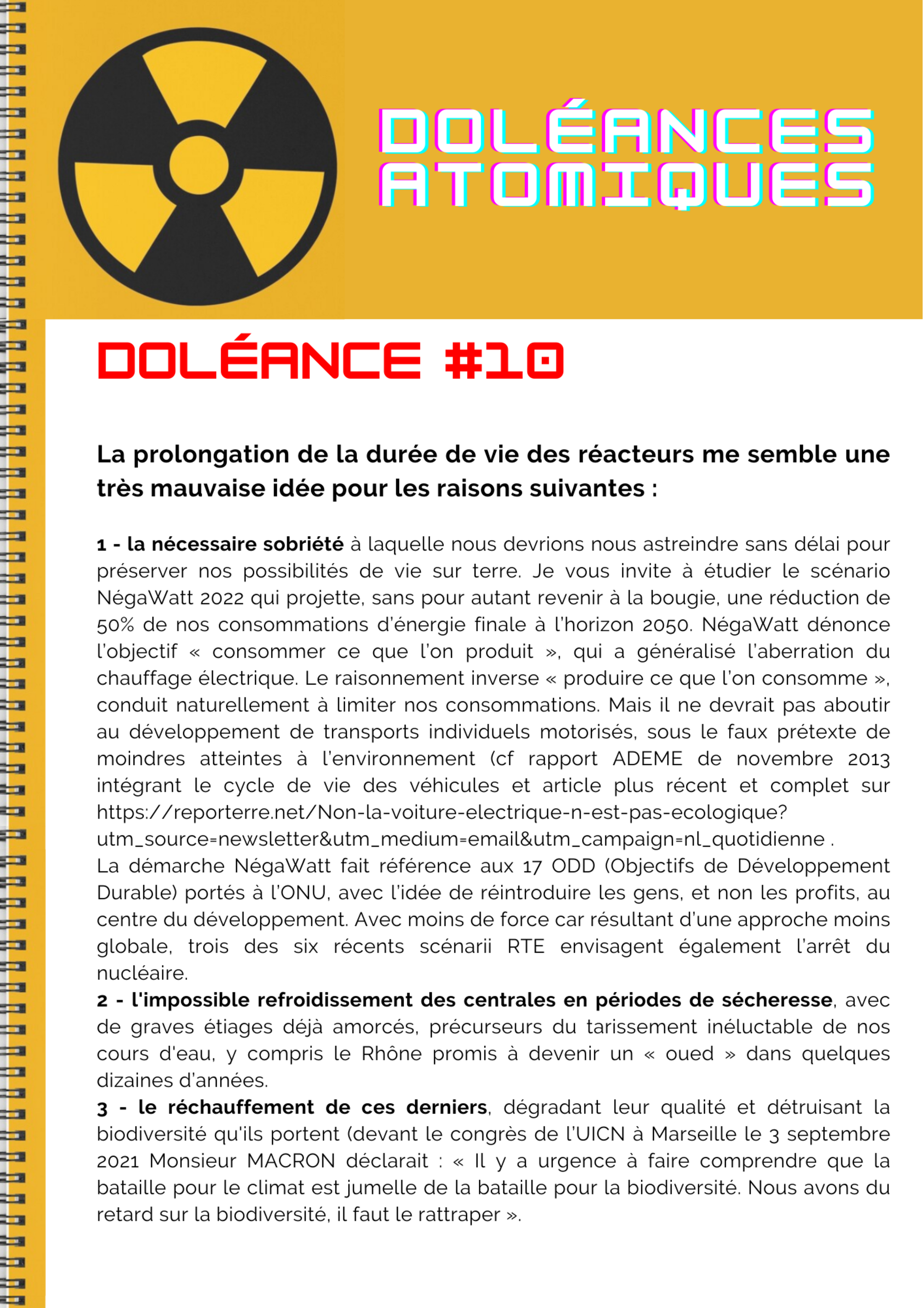 Voici donc, Monsieur le Commissaire enquêteur, sans exhaustivité, quelques raisons majeures de donner un avis défavorable à ce projet de prolonger la durée de vie de réacteurs nucléaires, auxquels il vaudrait mieux renoncer totalement dans les meilleurs délais, avant une catastrophe dont vous pourriez porter une part de responsabilité.