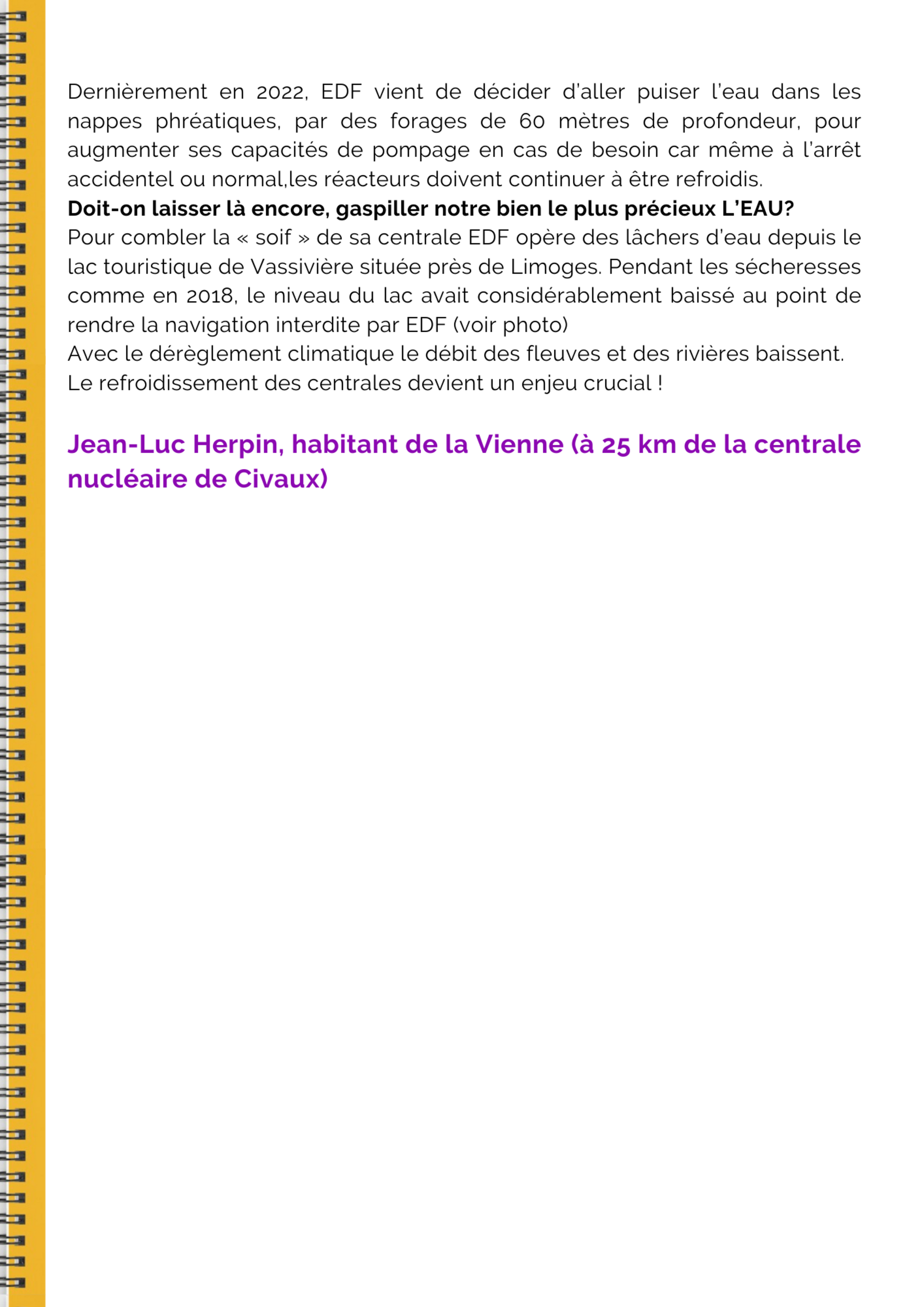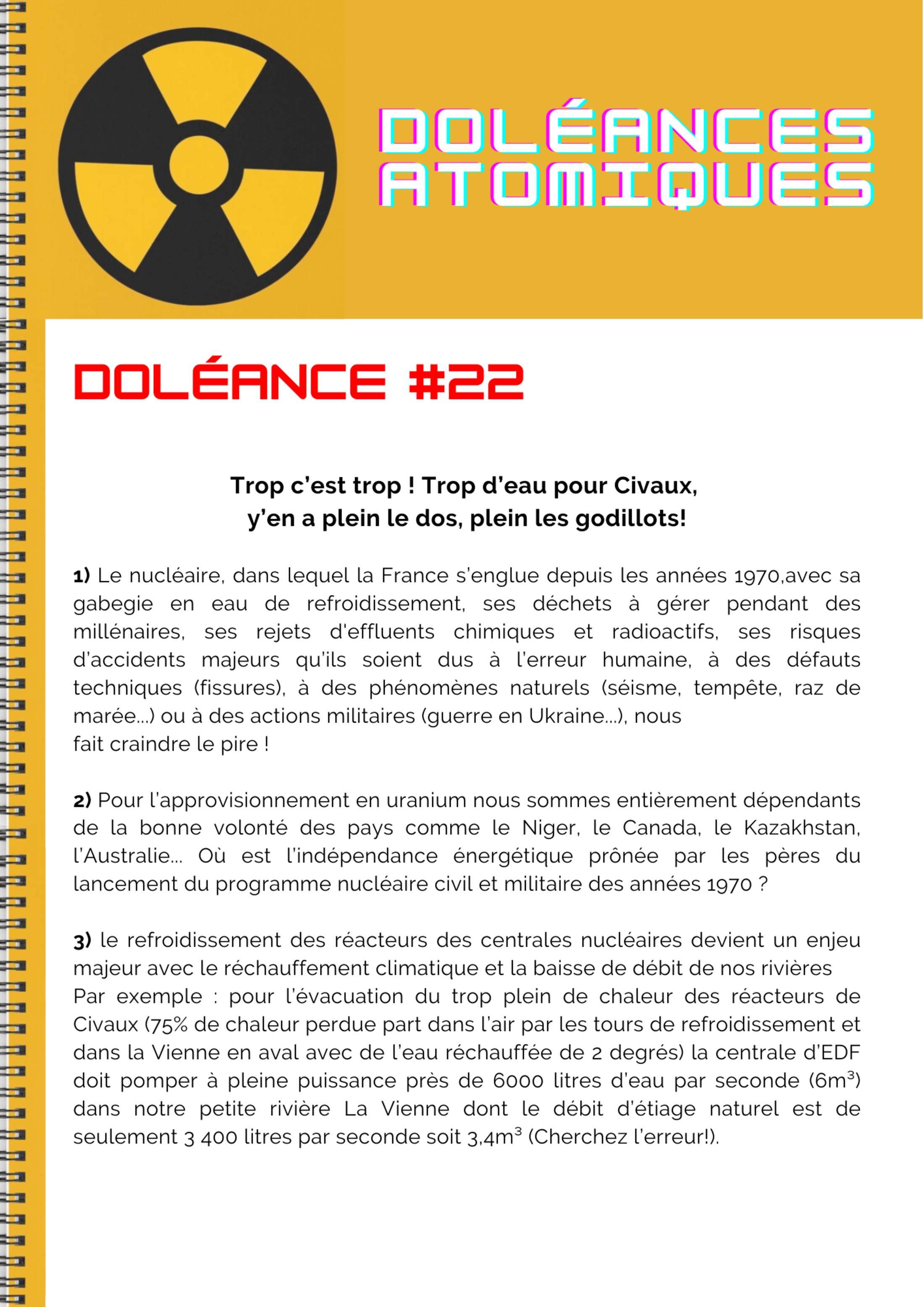 Par exemple : pour l’évacuation du trop plein de chaleur des réacteurs de Civaux (75% de chaleur perdue part dans l’air par les tours de refroidissement et dans la Vienne en aval avec de l’eau réchauffée de 2 degrés) la centrale d’EDF doit pomper à pleine puissance près de 6000 litres d’eau par seconde (6m³) dans notre petite rivière La Vienne dont le débit d’étiage naturel est de seulement 3 400 litres par seconde soit 3,4m³ (Cherchez l’erreur!).