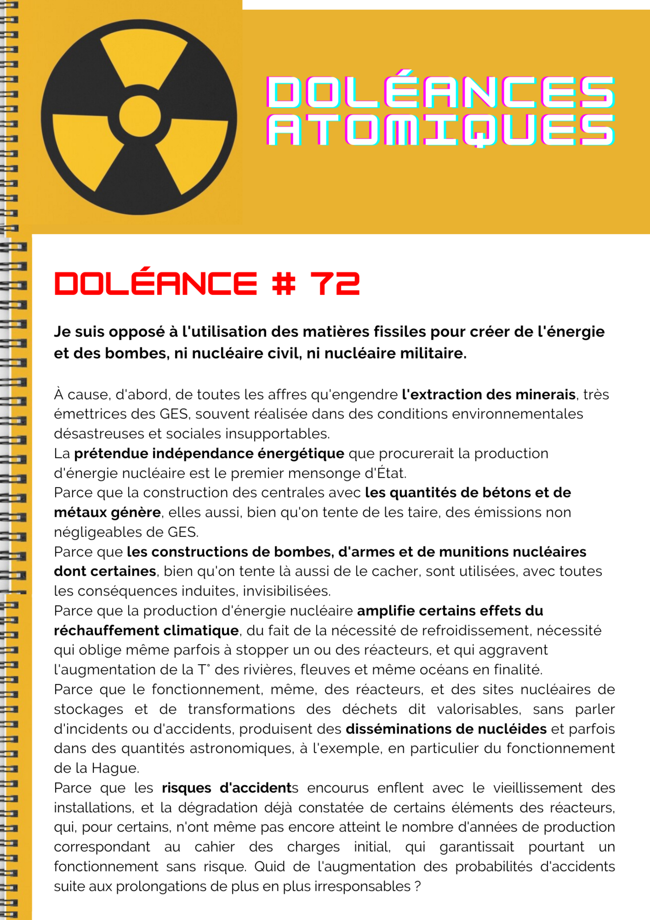 Pour toutes ces raisons et d'autres, je m'oppose au choix du nucléaire qui a été fait, à toute prolongation de durée de production des réacteurs actuels, et à toute construction de nouveaux réacteurs.