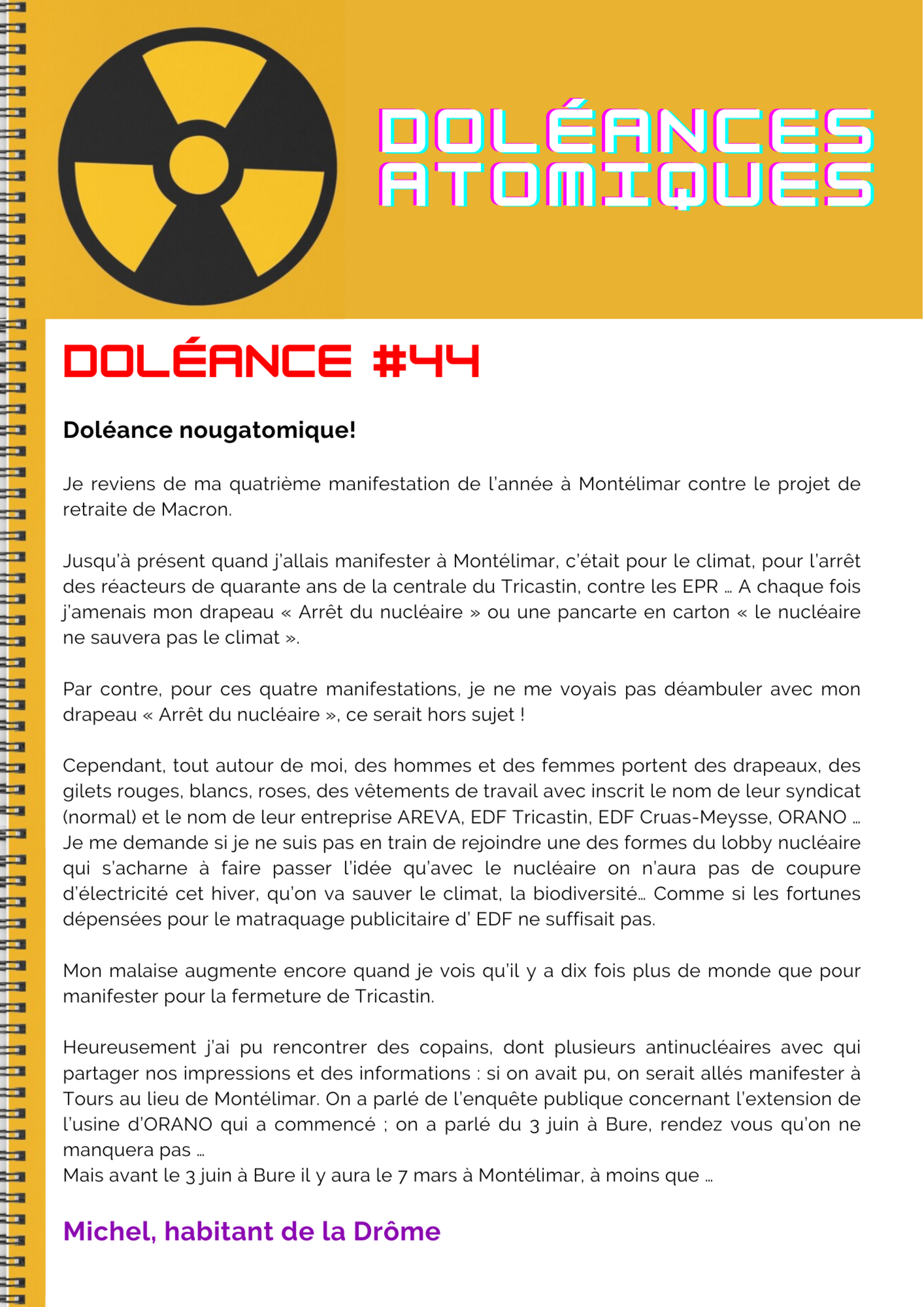 Jusqu’à présent quand j’allais manifester à Montélimar, c’était pour le climat, pour l’arrêt des réacteurs de quarante ans de la centrale du Tricastin, contre les EPR … A chaque fois j’amenais mon drapeau « Arrêt du nucléaire » ou une pancarte en carton « le nucléaire ne sauvera pas le climat ».
