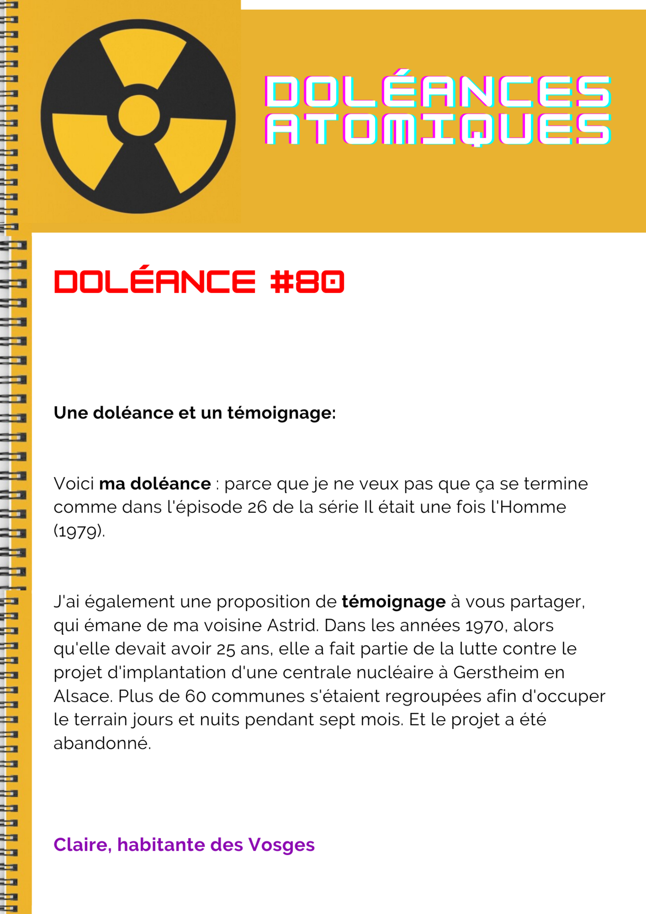 J'ai également une proposition de témoignage à vous partager, qui émane de ma voisine Astrid. Dans les années 1970, alors qu'elle devait avoir 25 ans, elle a fait partie de la lutte contre le projet d'implantation d'une centrale nucléaire à Gerstheim en Alsace. Plus de 60 communes s'étaient regroupées afin d'occuper le terrain jours et nuits pendant sept mois. Et le projet a été abandonné.
