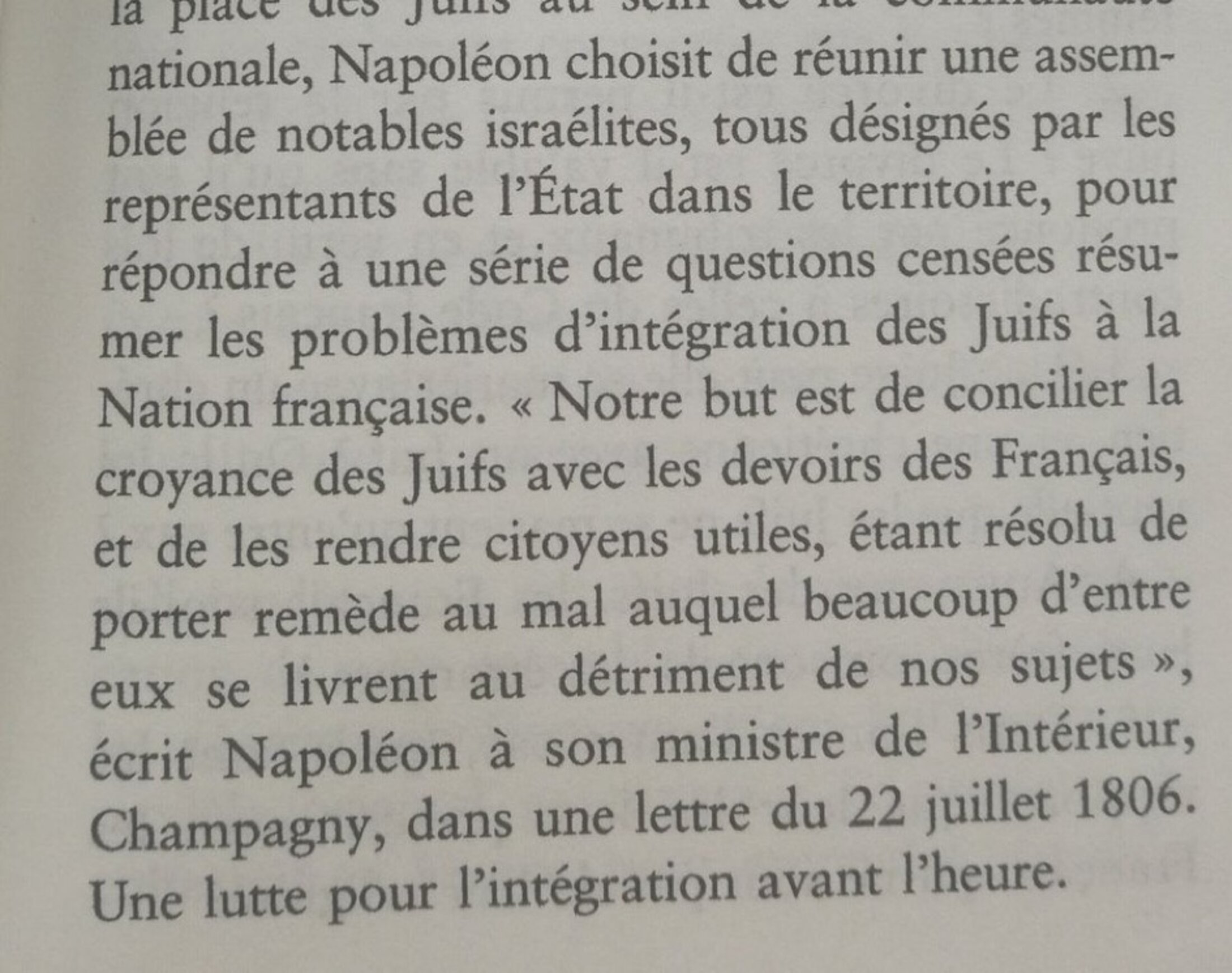 Puis le ministre de l’Intérieur rappelle que "Napoléon choisit de réunir une assemblée de notables israélites (...) pour répondre à une série de questions censées résumer les problèmes d'intégration des Juifs à la nation française". Et de citer une de ses lettres à son ministre de l'Intérieur : "Notre but est de concilier la croyance des Juif avec les devoirs des Français et de les rendre citoyens utiles, ÉTANT RÉSOLU DE PORTER REMÈDE AU MAL AUQUEL BEAUCOUP D'ENTRE EUX SE LIVRENT AU DÉTRIMENT DE NOS SUJETS."
