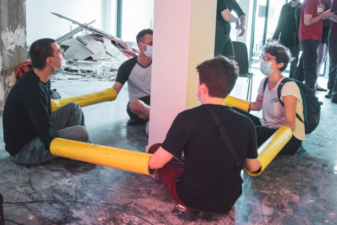 À 15h30 des membres du comité de soutien de l’Union des Sans-Papiers ont investi le hall d’entrée de l’Office des étrangers, ils se sont enchaînés, et d’autres sympathisants se sont amassés devant l’entrée du bâtiment.