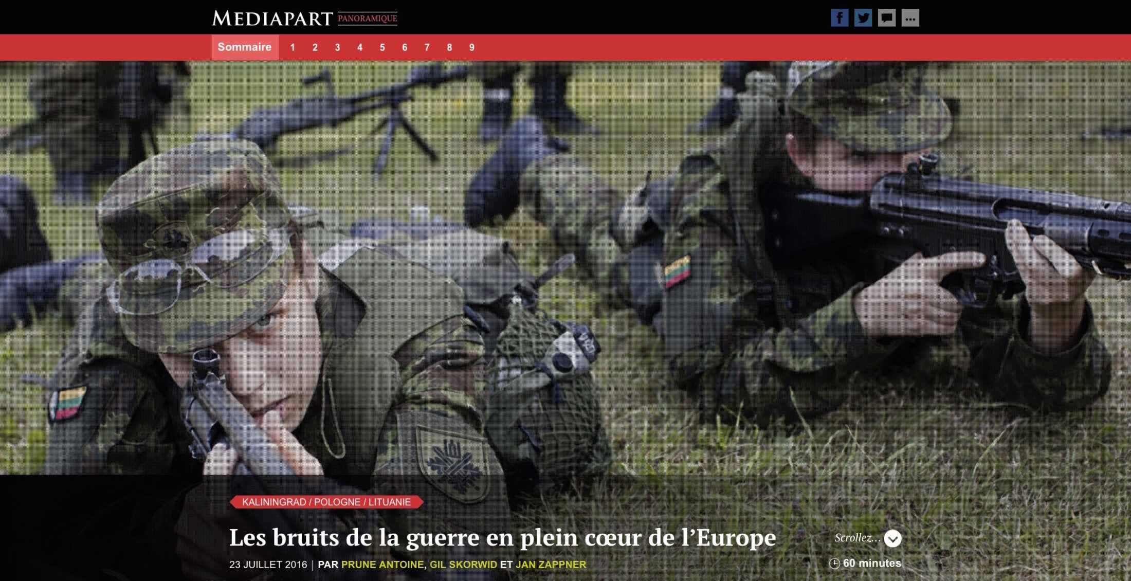 « Les bruits de la guerre en plein cœur de l’Europe », ce sont près de 75 000 signes de texte, une centaine de photos, plus des infographies et des vidéos. Et c'est avec cette expédition entre l'enclave russe de Kaliningrad, la Voïvodie polonaise de Varmie-Mazurie et la Lituanie, signée de la journaliste française installée à Berlin Prune Antoine, du Lituanien Gil Skorwid et du photographe allemand Jan Zappner, que Mediapart lance « Panoramique », sa toute nouvelle rubrique dédiée aux longs formats.