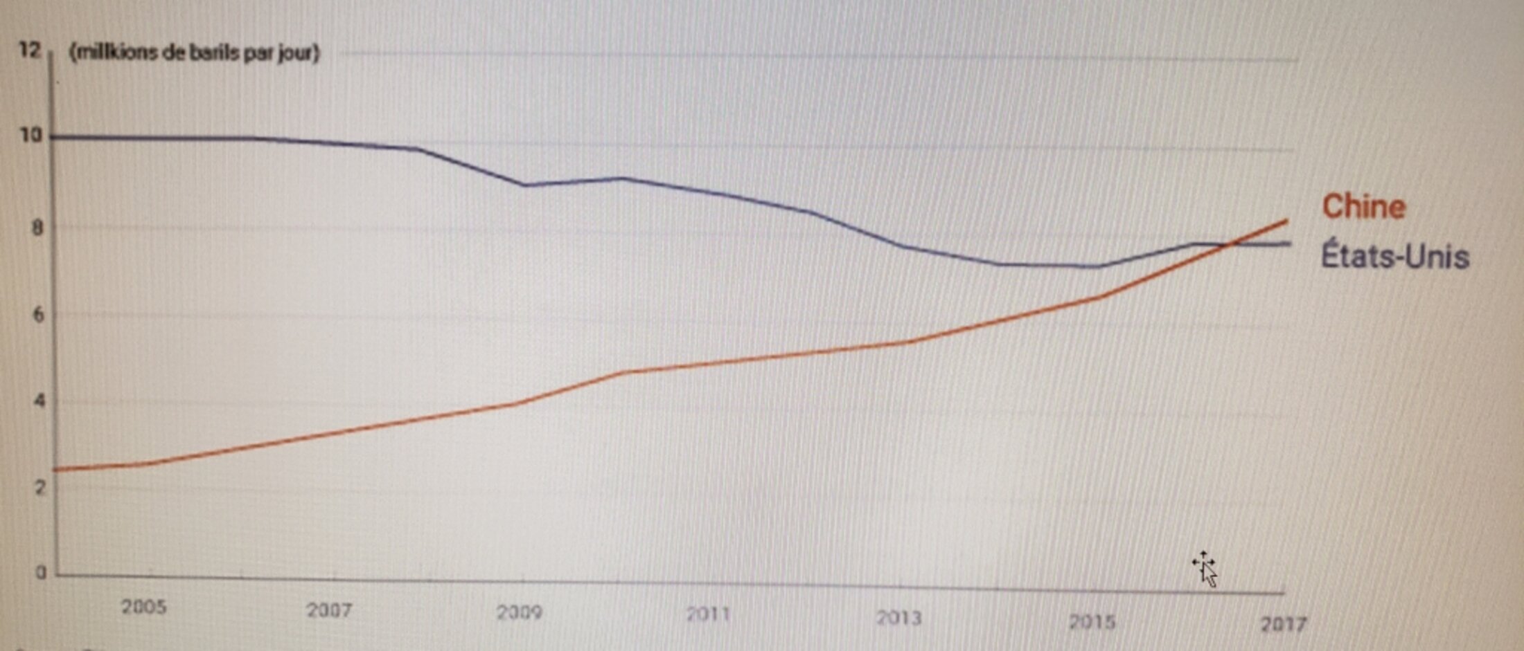 En 2017, les États-Unis ont importé près de 7,9 millions de barils de pétrole brut par jour (Mb/j), contre 8,4 Mb/j pour la Chine, qui devenait ainsi le premier importateur mondial de brut pour la première fois en moyenne annuelle, car elle l’était déjà au niveau des importations mensuelles à plusieurs reprises.