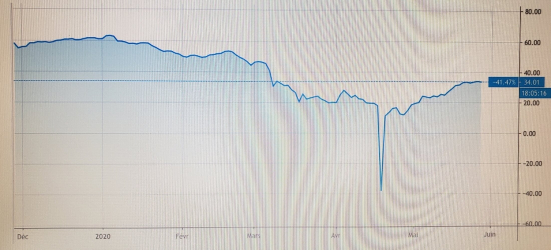 Le contrat à échéance en mai sur le baril de brut léger américain (West Texas Intermediate, WTI) est tombé lundi 20 avril 2020, à -40 dollars (voir Graphique 4), un mouvement totalement inédit, alimenté par des perspectives économiques déprimées et par la saturation des capacités de stockage aux États-Unis (il faut bien noter que cela s’est produit uniquement sur le marché américain).