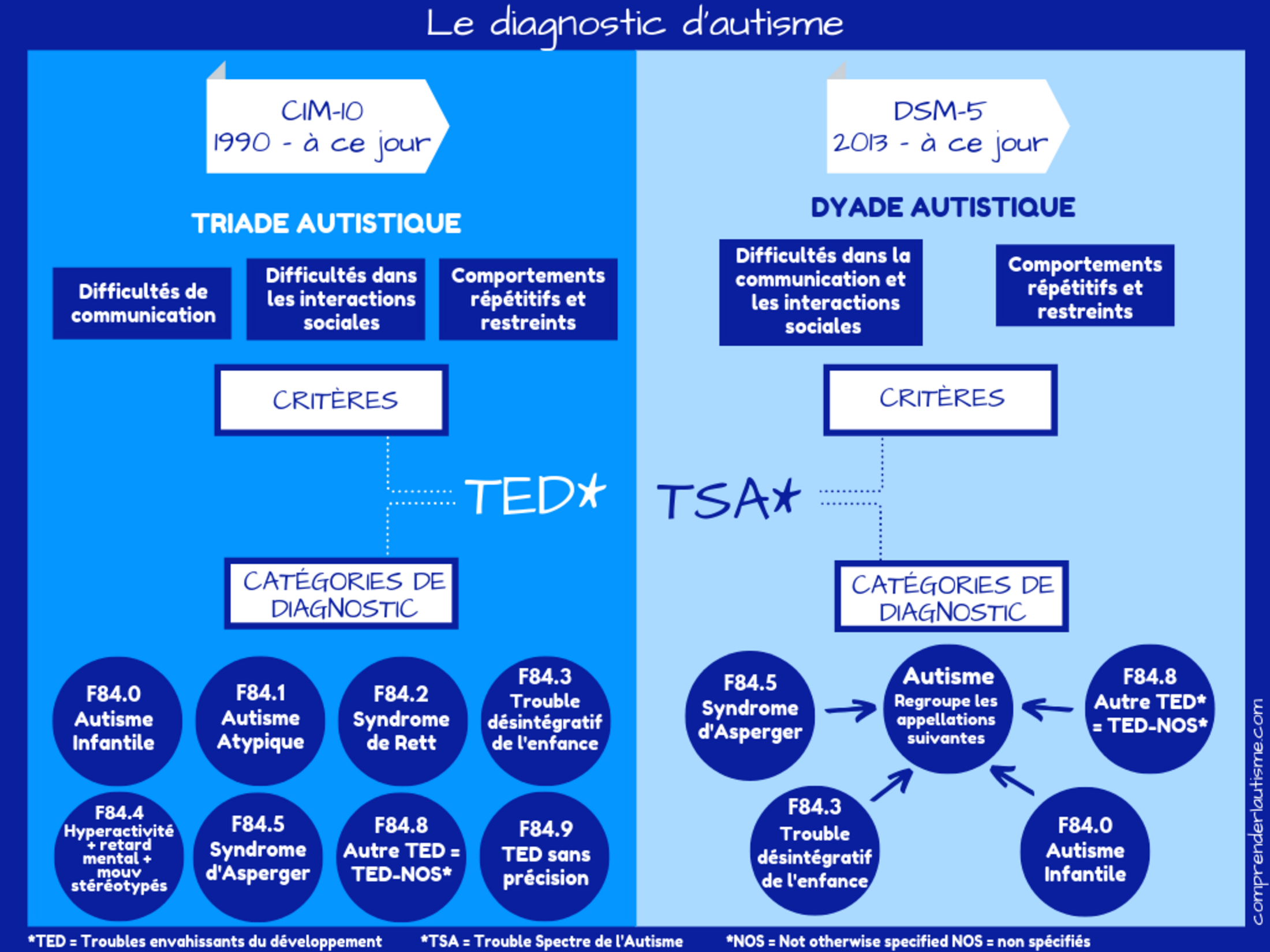 Dans le DSM-V, l’autisme disparaît derrière les « troubles du spectre autistique ». Les trois critères principaux ont été réduits à deux, les troubles des interactions sociales et les troubles de la communication ayant fusionné. Par ailleurs, en ce qui concerne l’autisme, les classifications nosographiques sont purement cliniques et catégorielles, avec une définition statistique du trouble. C’est-à-dire qu’elles appréhendent assez mal les dynamiques dimensionnelles et différentielles, notamment en termes d’intensité des troubles. Dans les tests reconnus à l’échelle internationale (type ADOS), le diagnostic est ainsi défini par un effet seuil, qui ne rend pas compte du continuum entre la normalité et le « pathologique ». De plus, le caractère ponctuel, clos et déterministe de ces procédures diagnostiques se référant uniquement à une théorie neurodéveloppementale contraint à sacrifier les dimensions temporelles, contextuelles, relationnelles, sociales, inconscientes, etc.