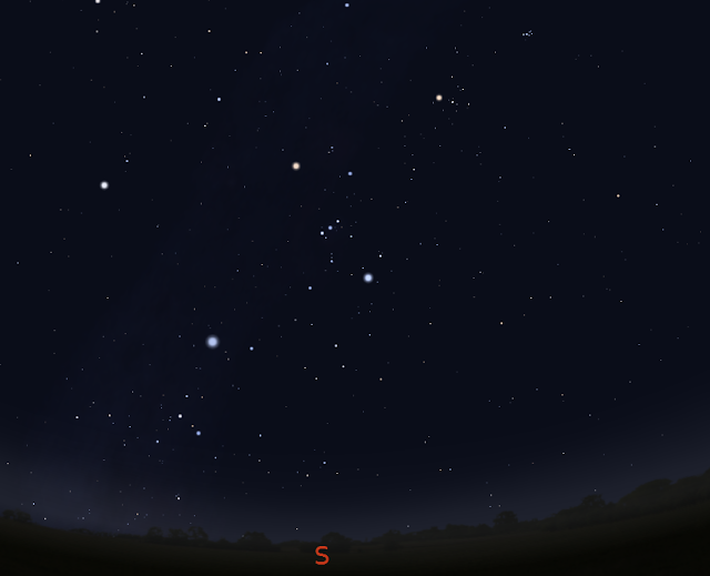 Nous descendons maintenant dans le dos de l'archer pour trouver une nébuleuse assez brillante, M78 (magnitude 8.0), qui enveloppe trois étoiles dont deux brillantes et une autre plus faible. Cette nébuleuse est presque ronde. Le champ autour est pauvre en étoiles car caché par un nuage plus sombre.
