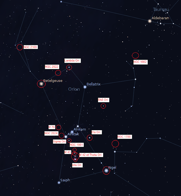 Et nous allons voir qu'Orion nous offre presque tous les types d'objets astronomiques que l'on puisse admirer...