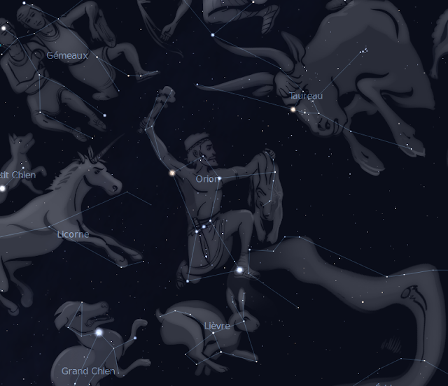 Traçons maintenant les différentes constellations qui entourent Orion. Le Taureau, les Gémeaux, La licorne et le Petit et le Grand Chien ainsi que le Lièvre viennent entourer l'archer céleste.