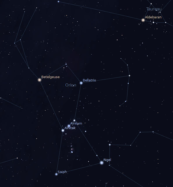 Nous commençons notre découverte par l'étoile la plus brillante de la constellation, qui montre une belle couleur rouge-orangée, c'est Bételgeuse (alpha Ori). Quand on observe Orion, il faut toujours surveiller Bételgeuse, pour la simple raison que cette étoile qui est une supergéante rouge située à 400 années-lumières seulement, peut exploser d'une minute à l'autre en une formidable explosion qui la rendra aussi lumineuse que la pleine lune et la rendra même visible en plein jour... Il faut donc y garder un œil des fois que ça arrive pile au moment où vous levez la tête...