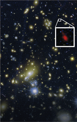 La grosse masse-lentille en question qu'ont utilisée Zeng et al est un amas de galaxies proche qui s'appelle MACS 1149 +2223. Et cet amas magnifie l'intensité lumineuse des galaxies distantes par un facteur 15 !