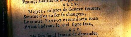 Un ami Suisse de Marseille me communique les dernières nouvelles du front... 1 • Un scoop... vieux de plusieurs siècles ! Une "terrible et effrayante" rumeur se répand actuellement sur le web, à mesure que les premiers essais du LHC approchent (prévus au CERN pour le 10 septembre). Ledit LHC pourrait engendrer une sorte de mini trou noir, lequel signerait rien moins que la fin du monde. Une fin du monde paraît-il prédite par Nostradamus — spécialiste du genre (du moins par ceux qui le prennent au pied de la lettre) — dans l'un de ses quatrains. Il s'agit du quatrain 9-44, que nous avons retrouvé (dans une rarissime édition des Prophéties de 1697) :