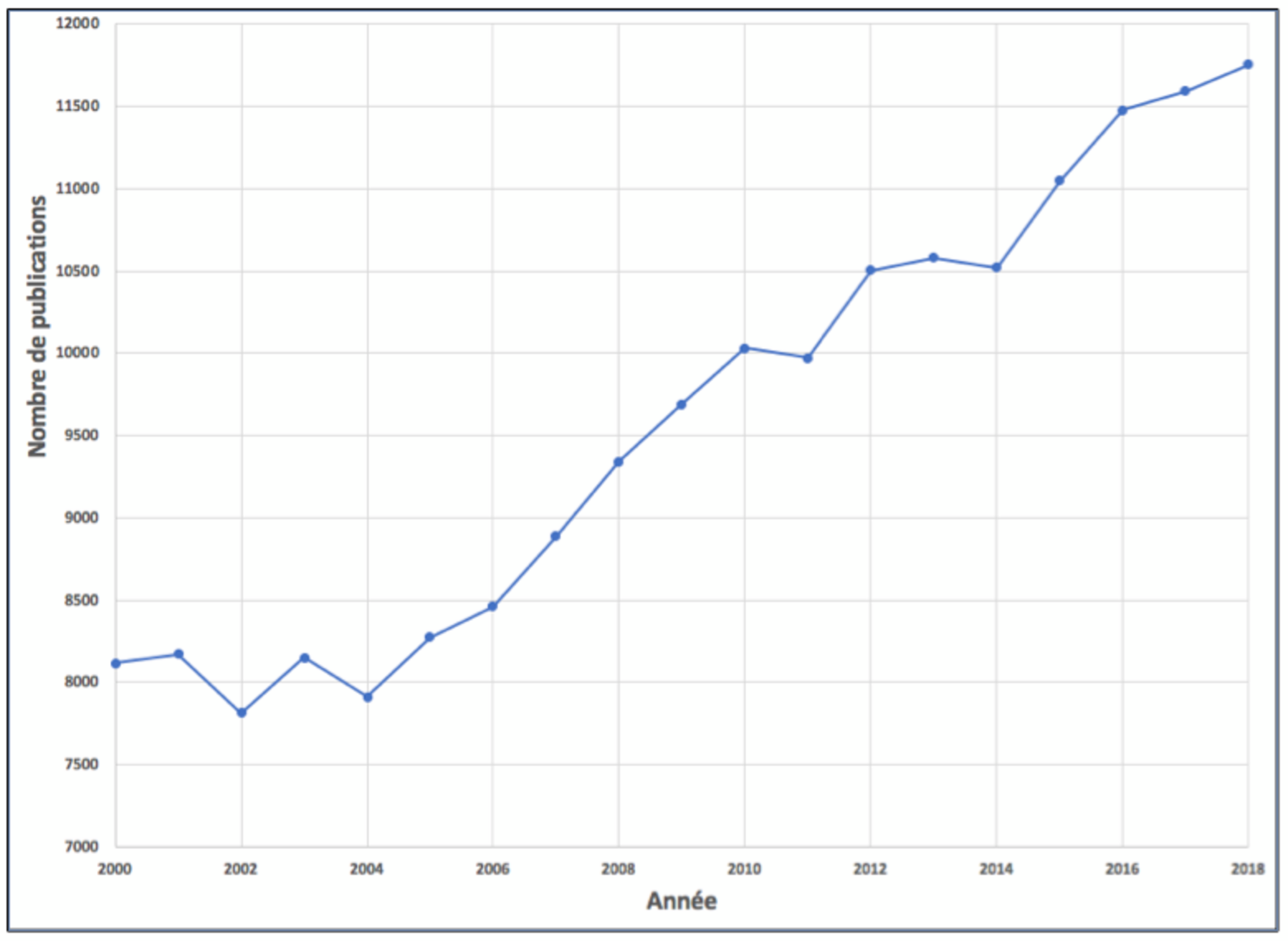 Ces publications ne sont donc pas recensées comme des publications de CHU dans le WoS, alors qu’elles le sont dans SIGAPS, puisque les chercheurs valident personnellement leurs publications dans ce système et peuvent donc inclure même celles qu’ils ont signées avec d’autres adresses institutionnelles. Malgré ces limites, nos données suffisent pour observer l’effet de SIGAPS sur les publications : entre 2000 et 2018 on observe une augmentation de 45%. La croissance de l’ensemble des publications françaises dans les mêmes disciplines et pour la même période est de 47% et suit la même tendance.