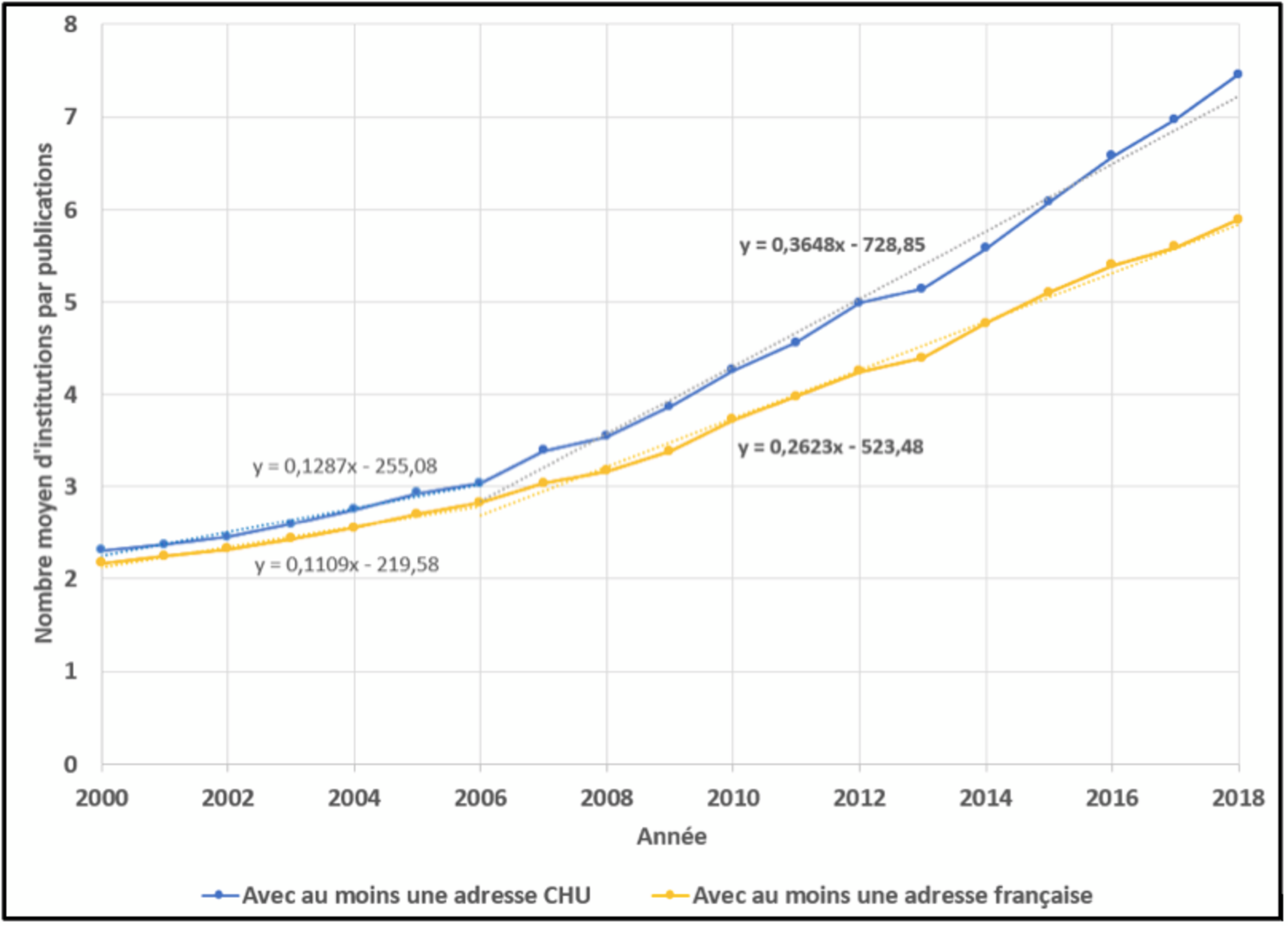 L’écart constaté entre la croissance globale du nombre de publications et la croissance des contributions individuelles de chaque CHU suggère que le nombre de publications des CHU en collaboration avec d’autres institutions, françaises ou étrangères, n’a cessé d’augmenter entre 2000 et 2018. Comme le montre la Figure 2, le nombre moyen d’institutions cosignataires de publications où figure au moins une adresse de CHU est passé de 2.31 en 2000 à 7.45 en 2018 (courbe bleue).